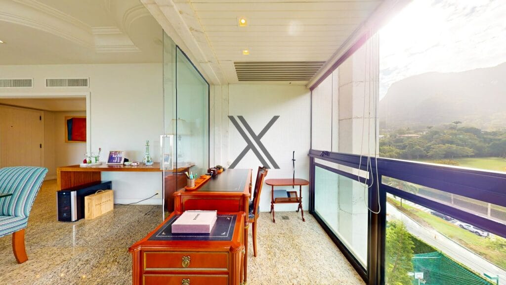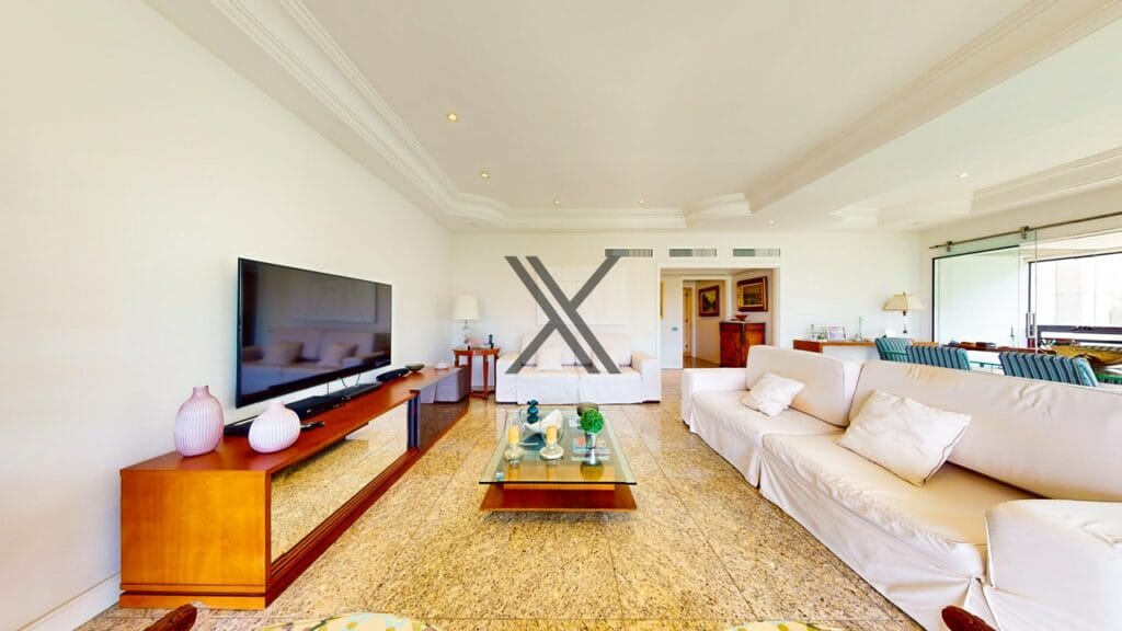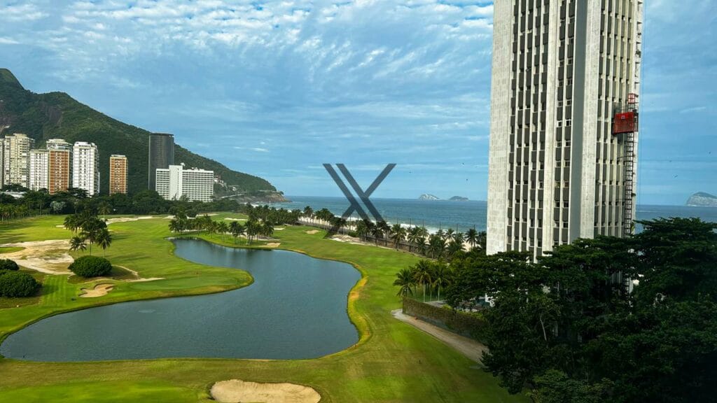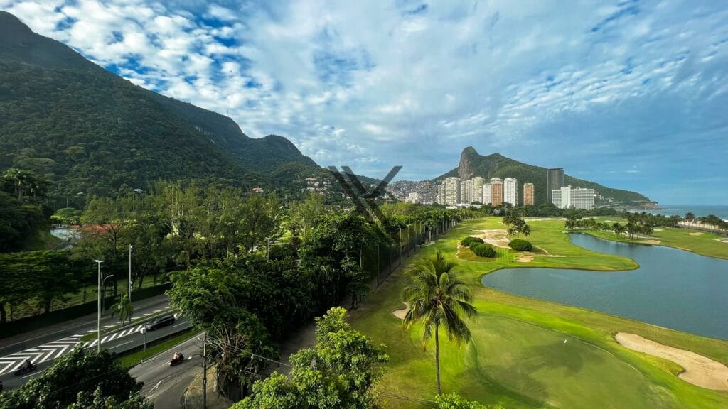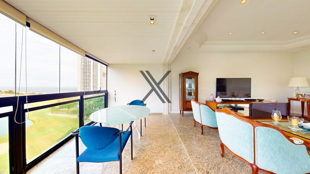 O hall de entrada oferece vista livre e agradável para o campo de golf e para a Praia de São Conrado, além de dar acesso à ampla sala de estar com TV integrada à sala de jantar. Conta também com um escritório e um lavabo para suporte a visitas e moradores.