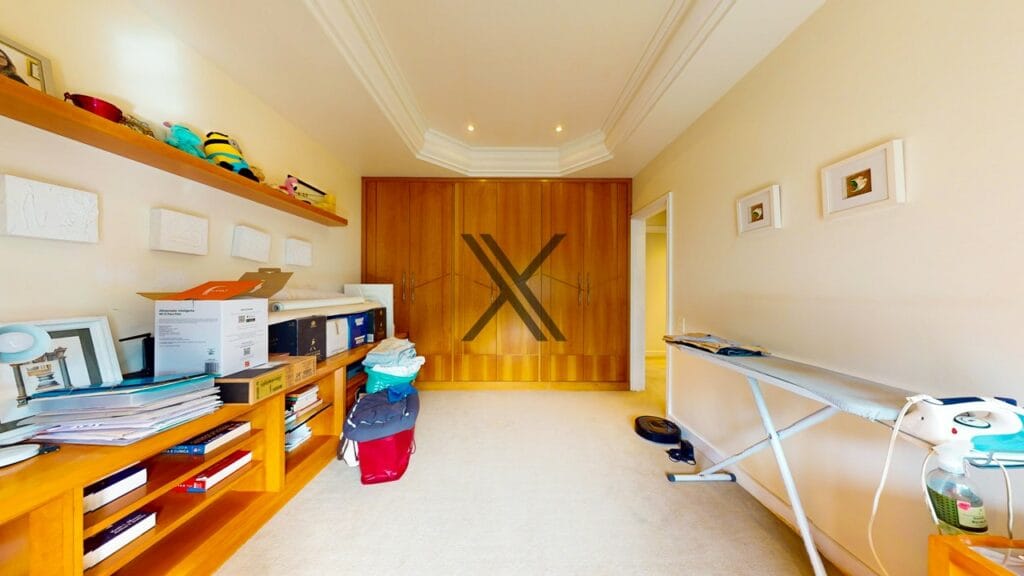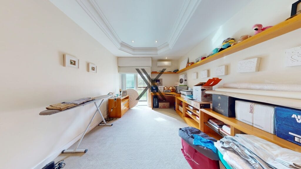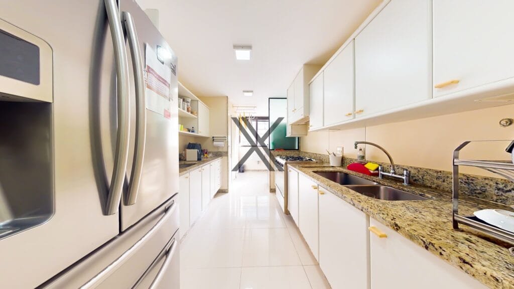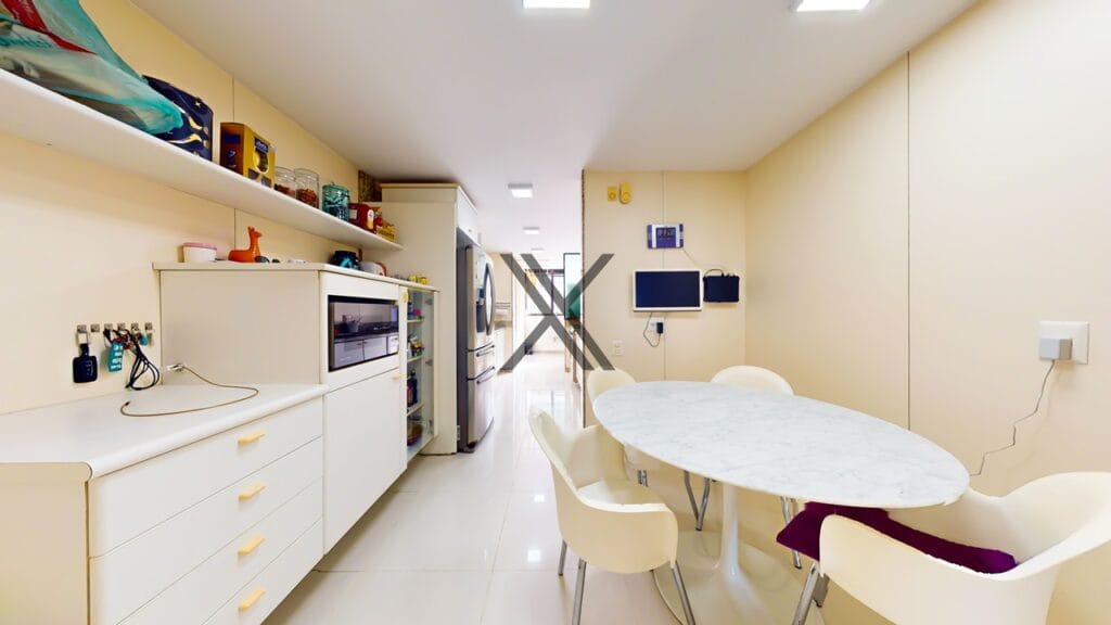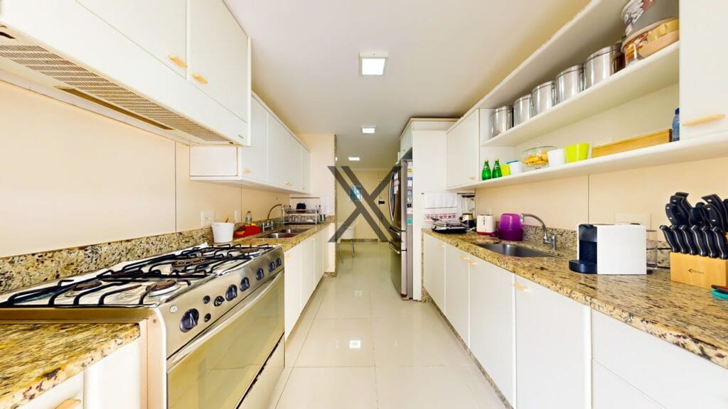 A cozinha apresenta armários feitos sob medida em grande quantidade, além de uma copa para a praticidade do cotidiano e bancadas longas para apoio e organização. Já a área de serviço é separada da cozinha e oferece acesso à dependência completa para funcionários.