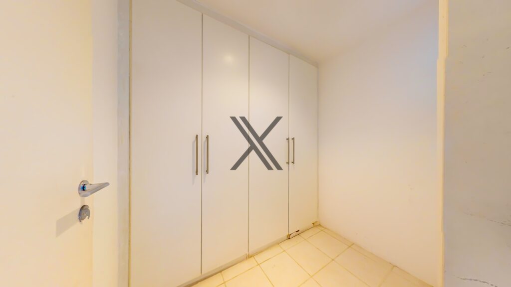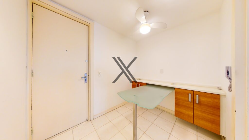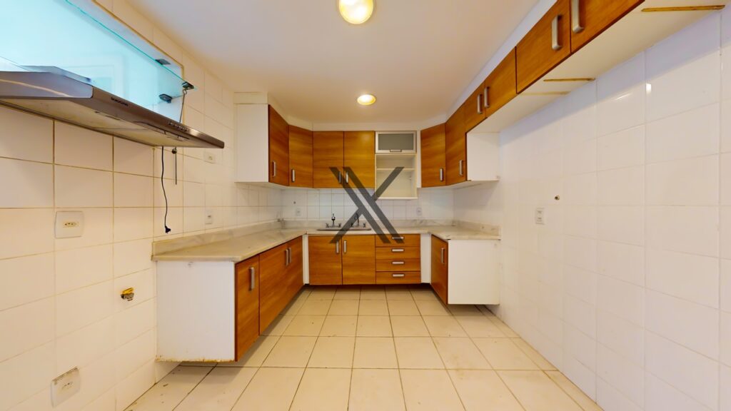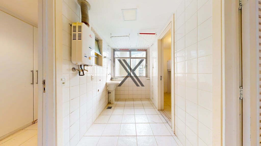 O apartamento também possui uma cozinha com copa e armários e uma área de serviço com duas dependências para funcionários.