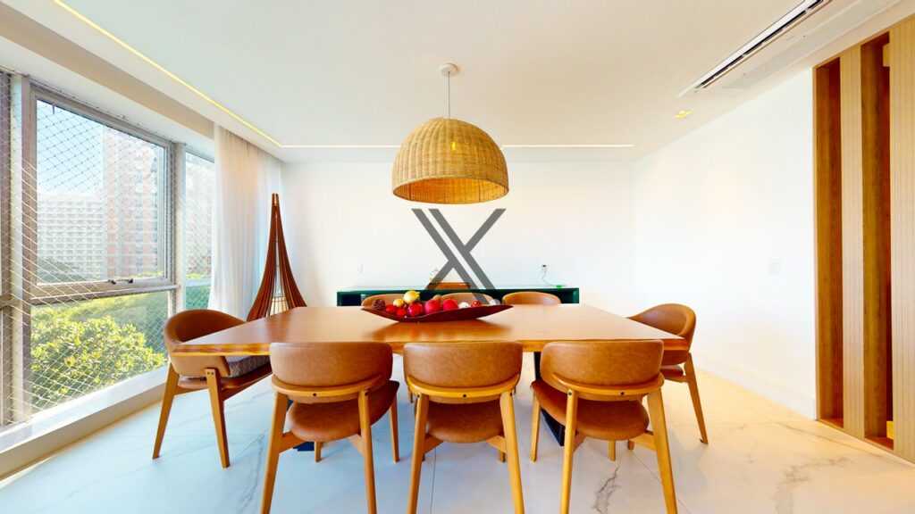 O imóvel é composto por sala de estar em dois ambientes de 70 m², com ar-condicionado split, aconchegante varanda anexada à sala, ampla sala de jantar para oito lugares, lavabo reformado em anexo, cozinha/copa bem espaçosa e área de serviço com duas dependências para empregadas.