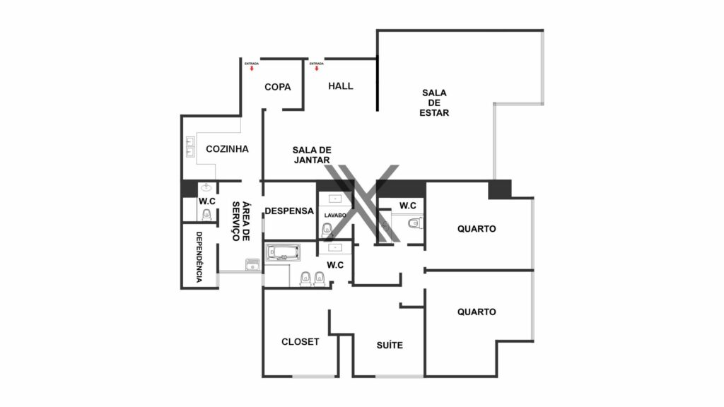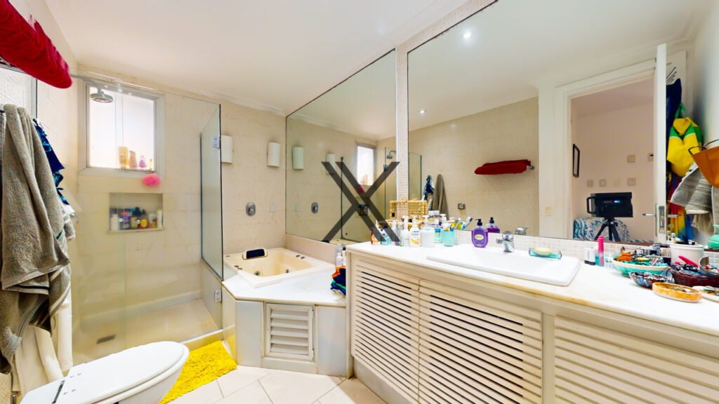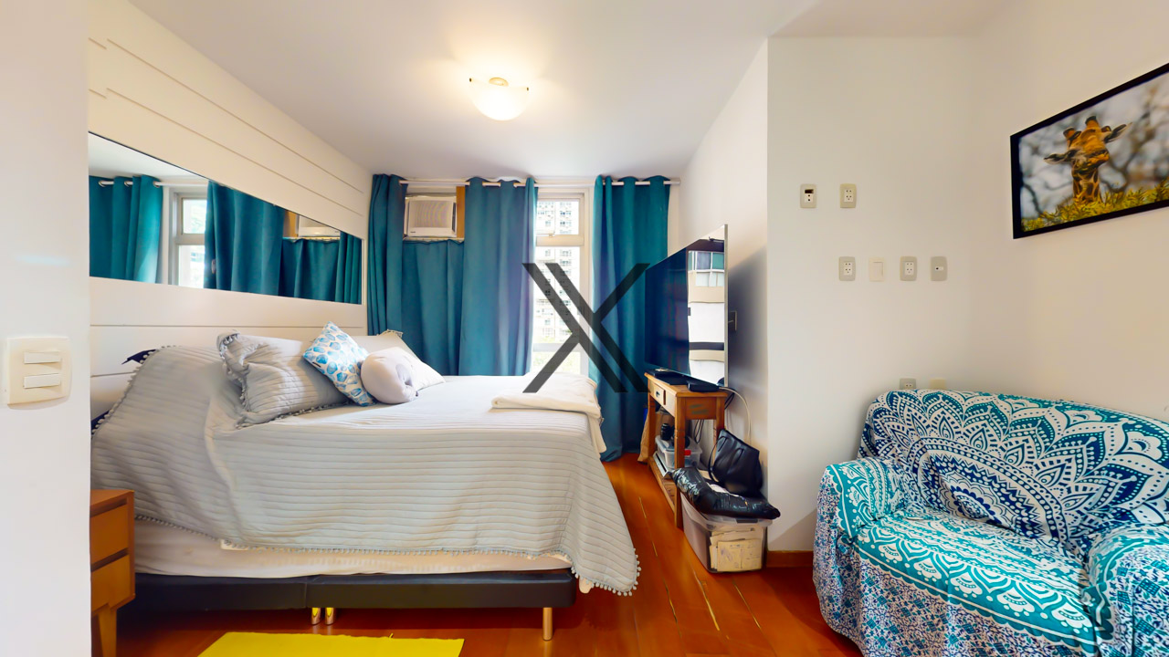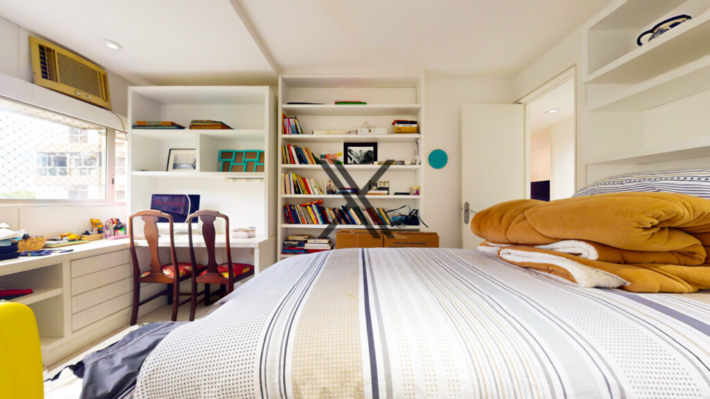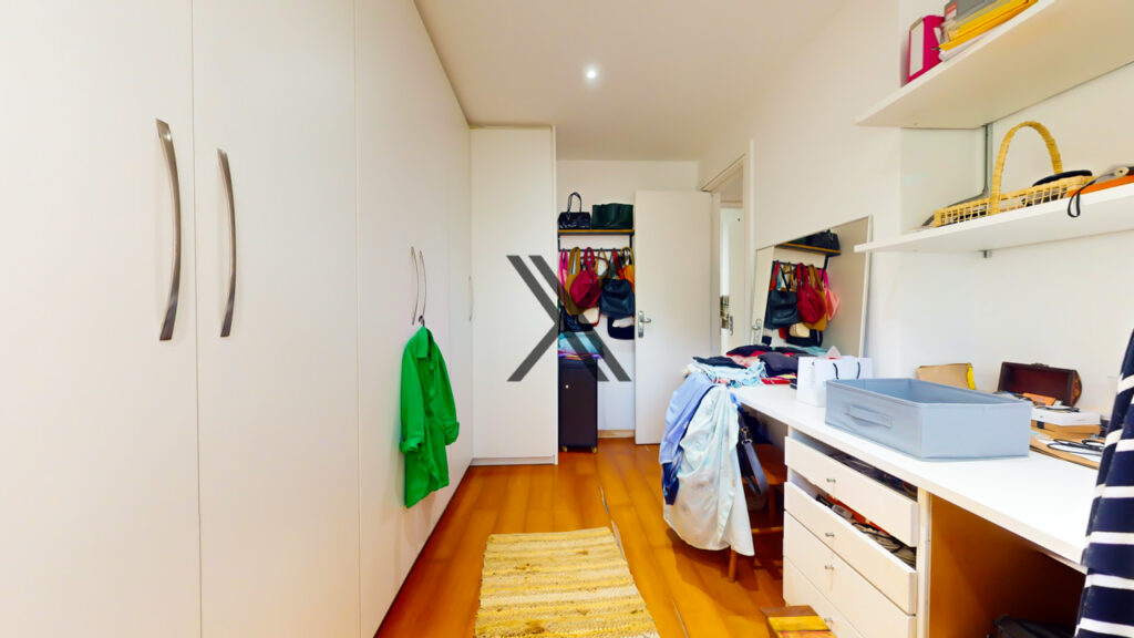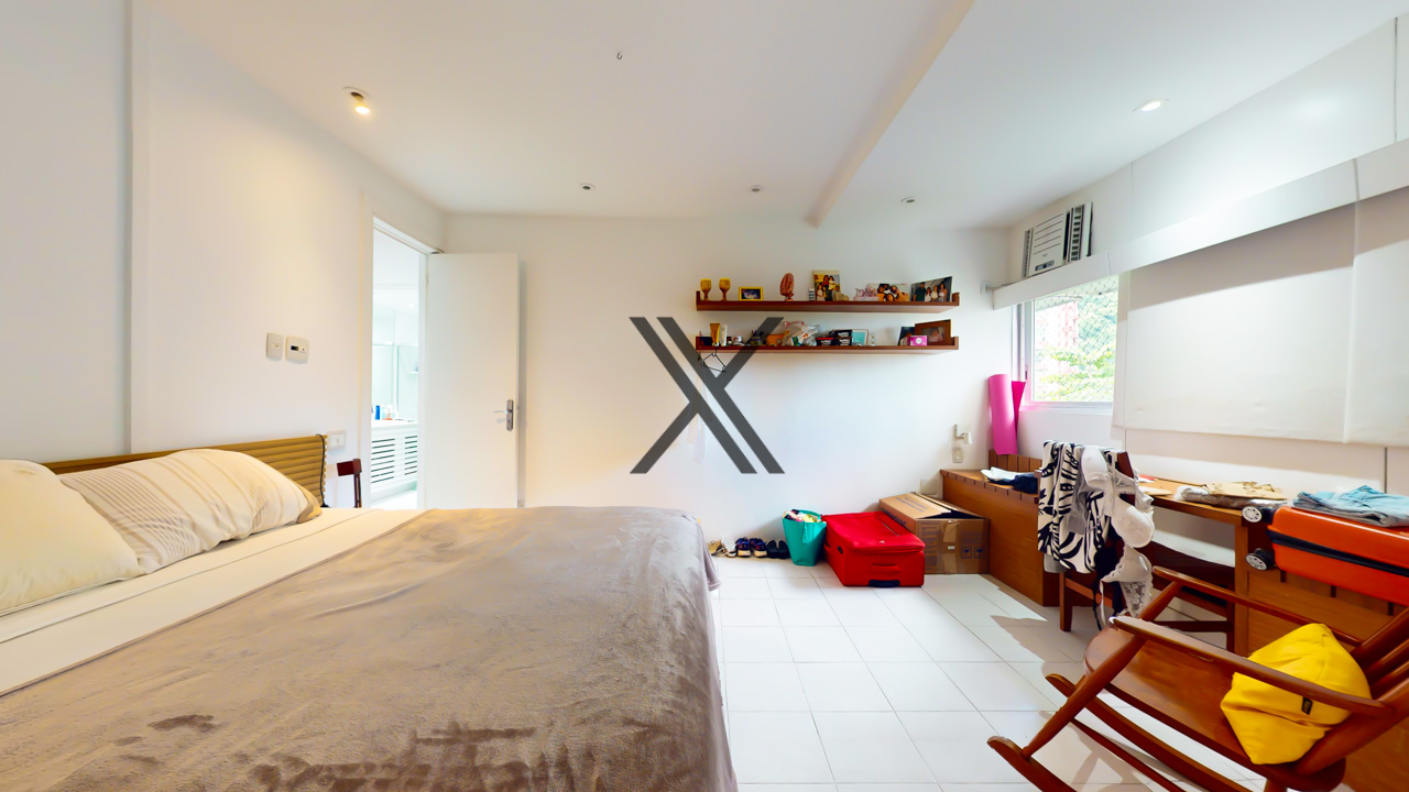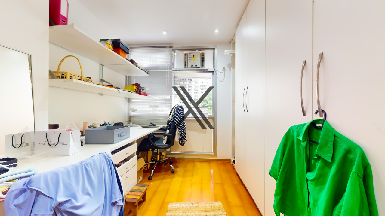 No acesso à área privativa, o apartamento é composto por 3 quartos (1 suíte), todos bem amplos. Originalmente, a planta dispõe de 4 quartos, porém um deles foi anexado à suíte e transformado em closet. A área ainda conta com uma rouparia em seu corredor.