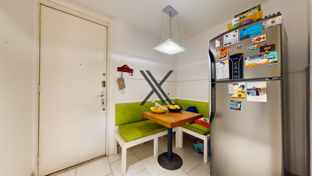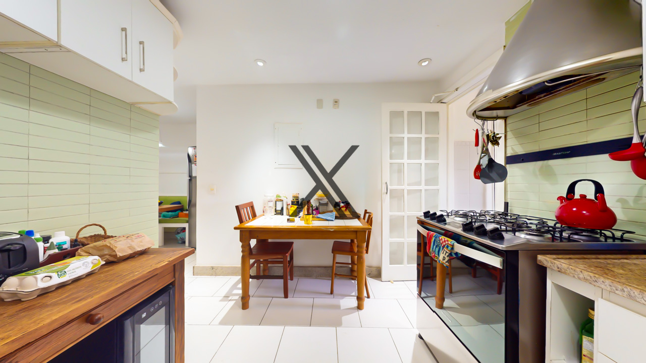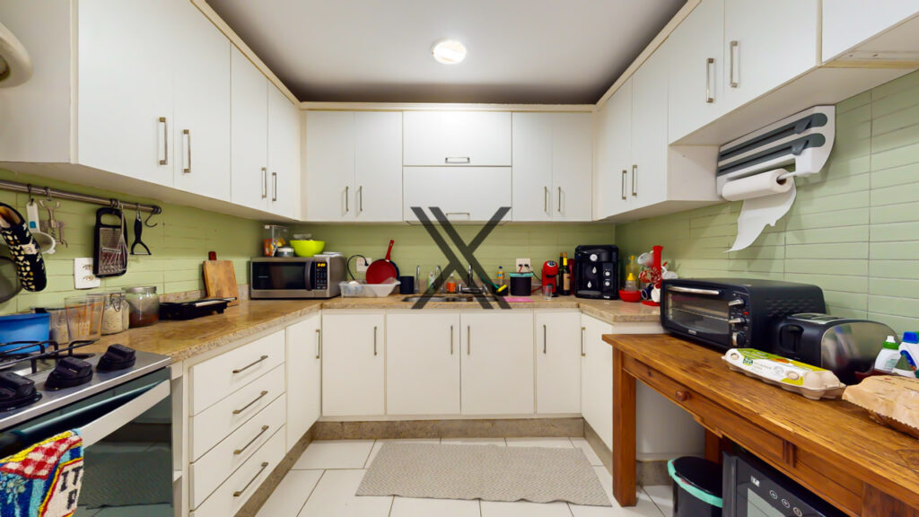 A cozinha apresenta armários feitos sob medida, além de ter uma copa para a praticidade do cotidiano e bancadas longas para apoio e organização. Por sua vez, a área de serviço é separada da cozinha e oferece acesso a uma dependência completa para funcionários e despensa.