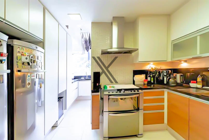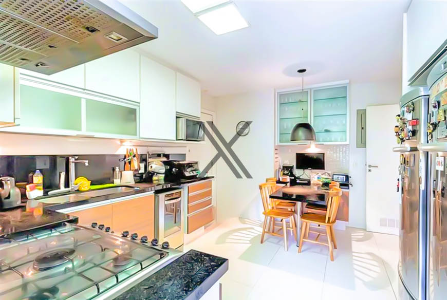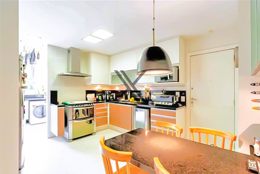 A cozinha é muito ampla, quadrada, contando com uma mesa de refeições e armários planejados. Em anexo, está a área de serviço com dependência completa para funcionários.