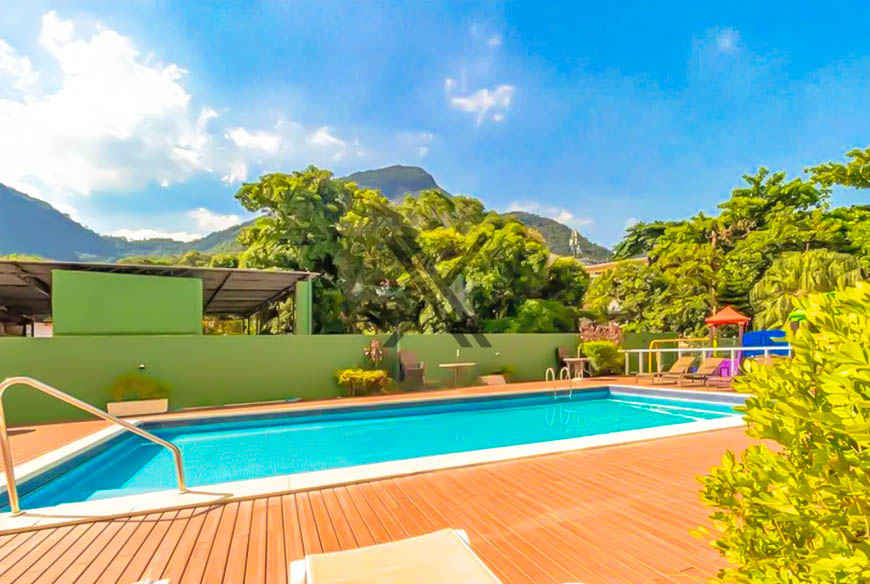Apartamento de 146 m², silencioso e em andar baixo, localizado na Estrada do Joá. O imóvel é indevassável, muito bem iluminado e arejado. Com linda vista para Pedra da Gávea e para o mar da varanda da suíte.