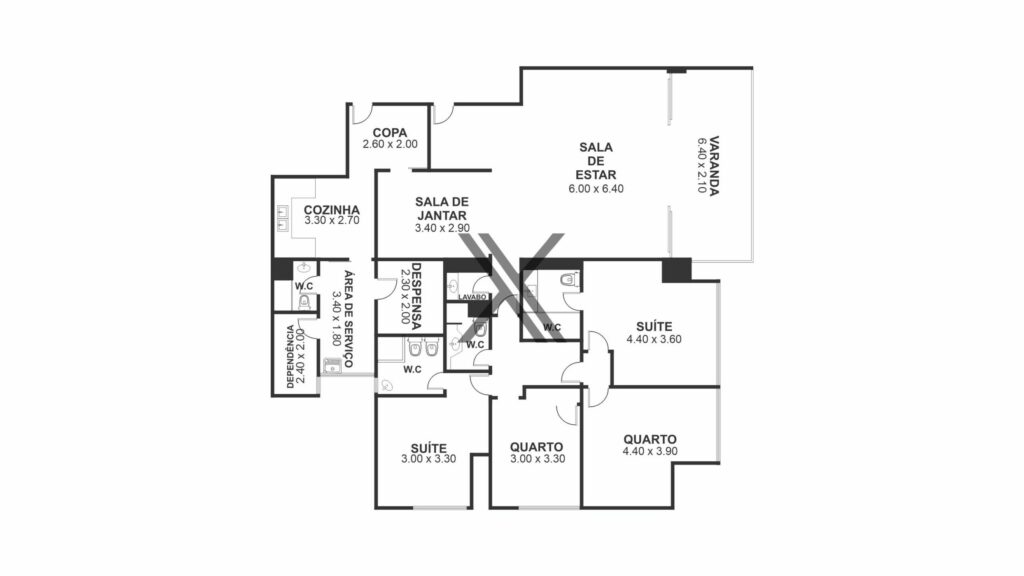 O apartamento também possui uma cozinha com copa e armários e uma área de serviço com duas dependências para funcionários.