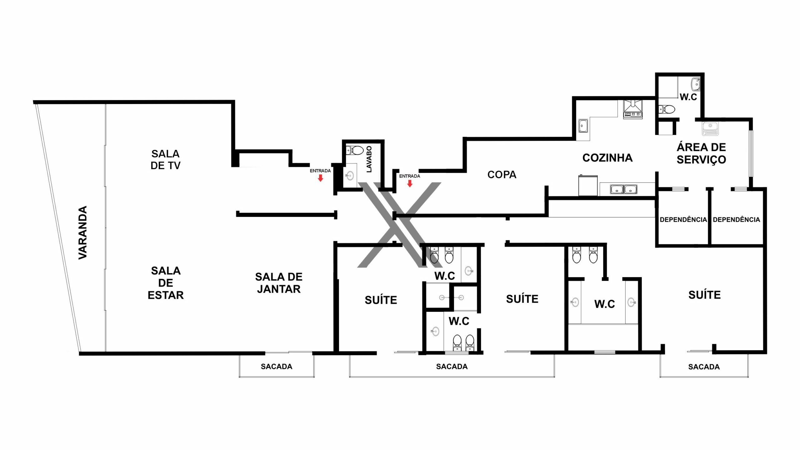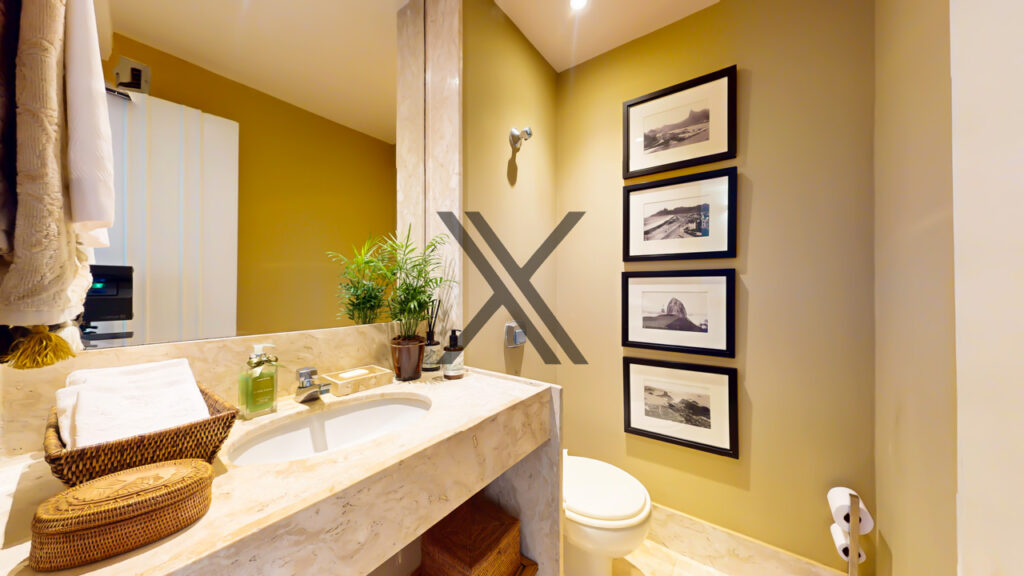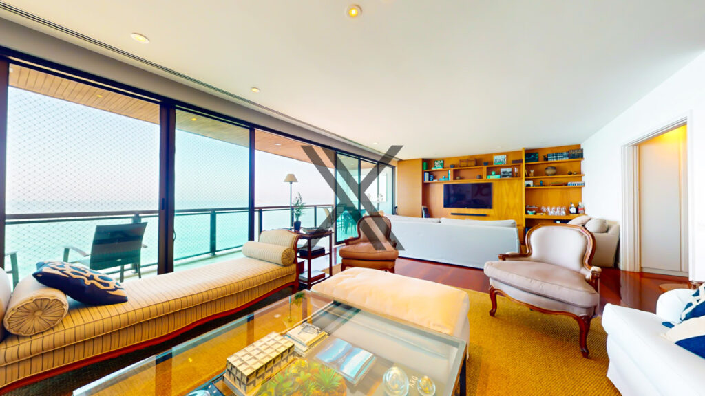 A área social conta com um hall de entrada e uma ampla sala que pode ser dividida em até 3 ambientes, integrada a uma varanda com vista livre para a Praia de São Conrado, além de um lavabo para suporte às visitas e aos moradores completa o ambiente.