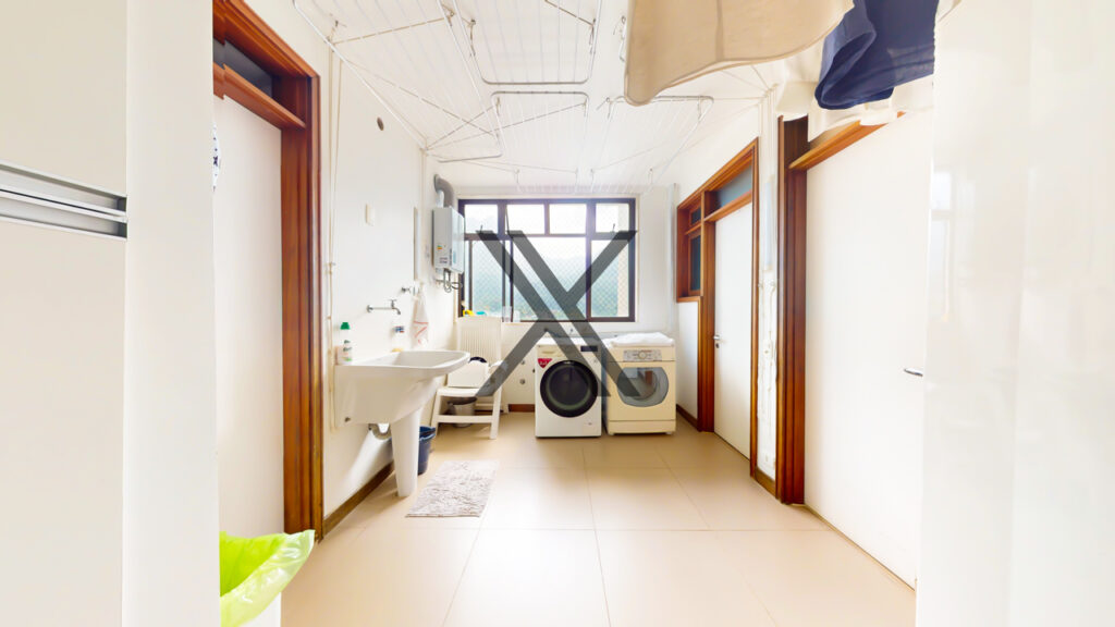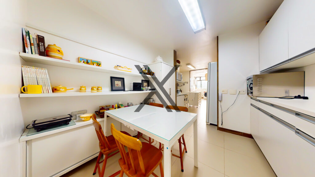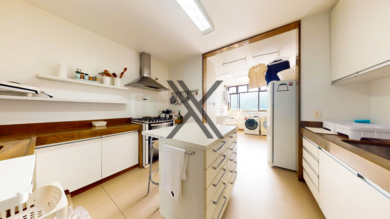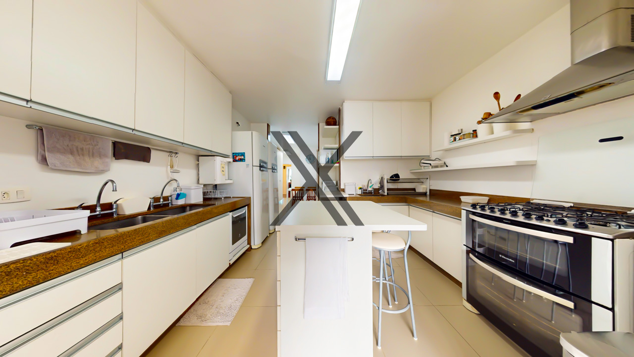 A cozinha apresenta armários feitos sob medida em grande quantidade, além de uma copa para a praticidade do cotidiano e bancadas longas para apoio e organização. A área de serviço é separada da cozinha e oferece acesso a duas dependências completas para funcionários.