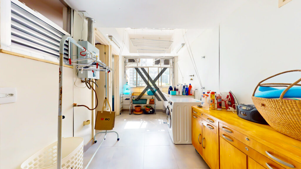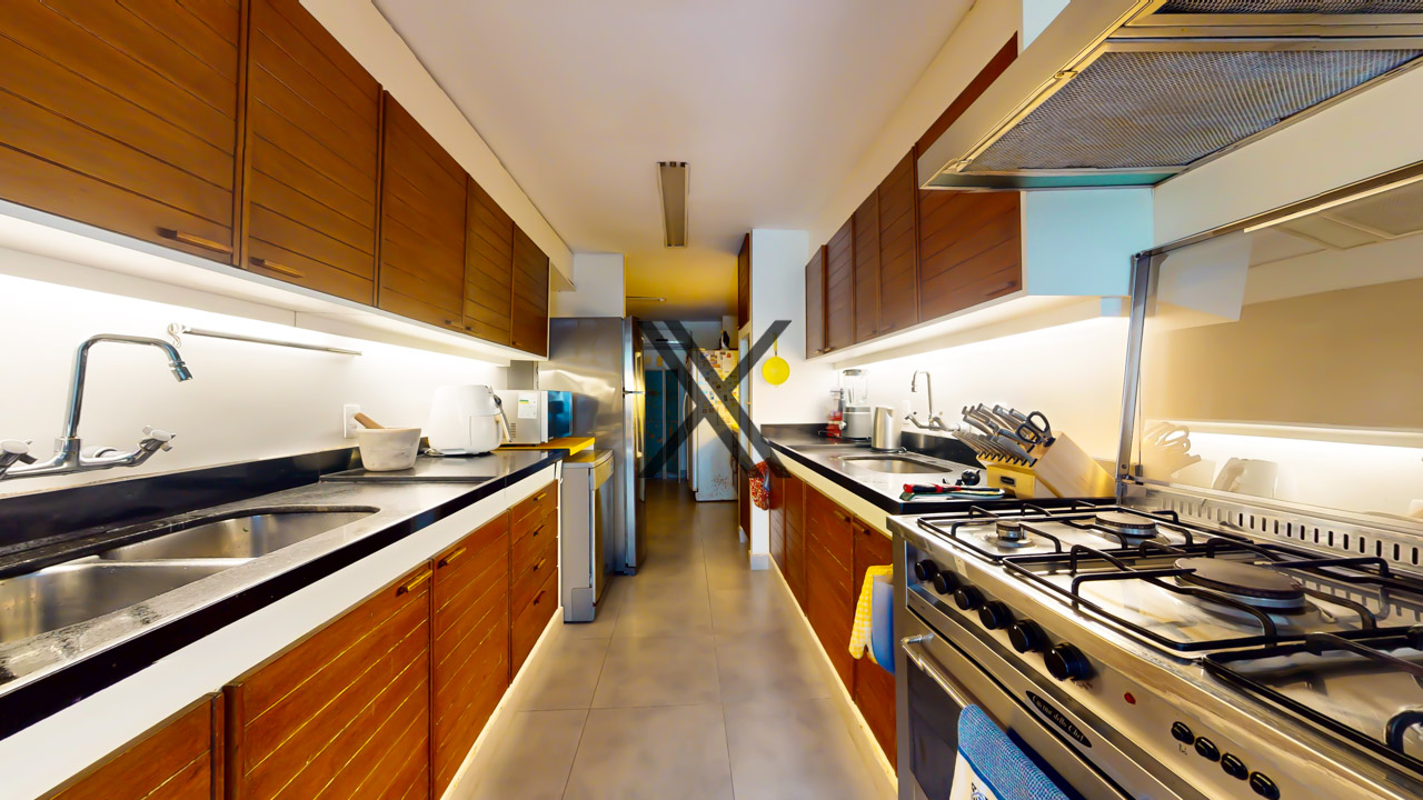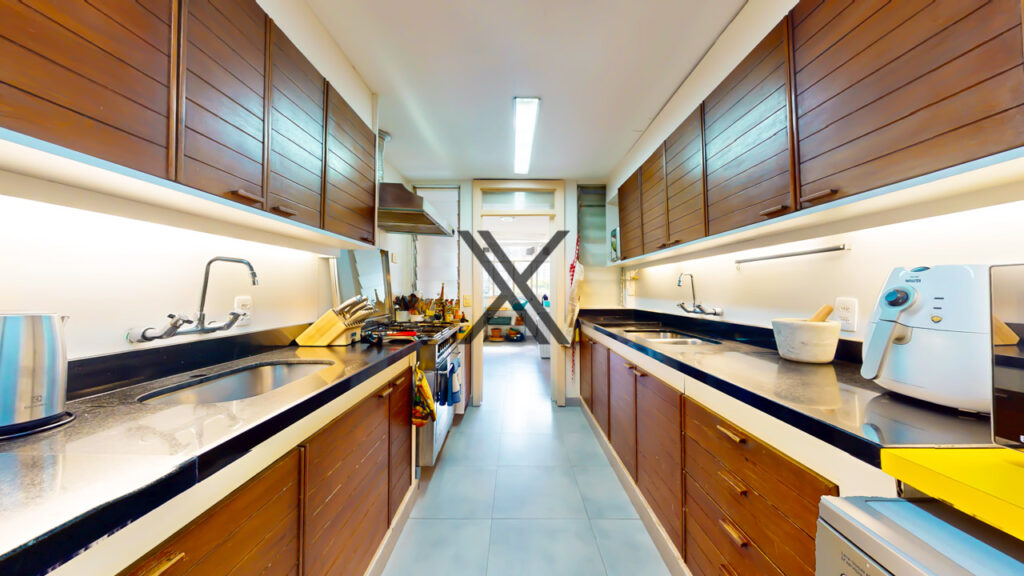 A cozinha é bem espaçosa e apresenta uma área de copa, muitos armários e bancadas longas para apoio e organização, além de duas pias. Em anexo, está a área de serviço com duas dependências completas para funcionários.