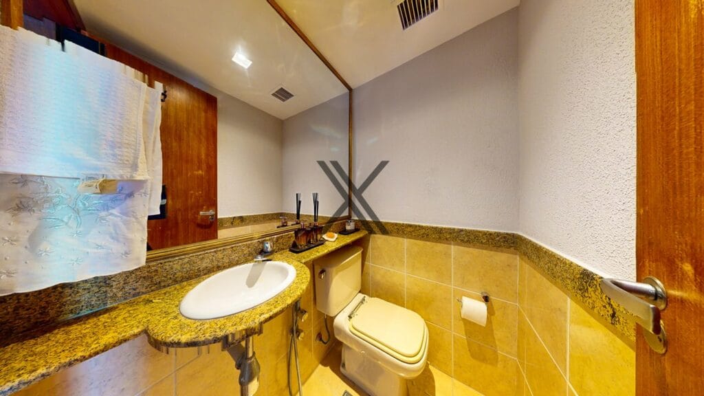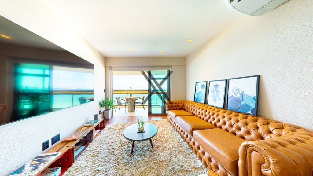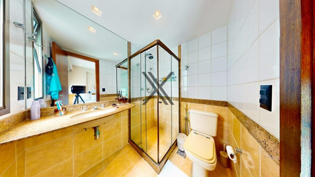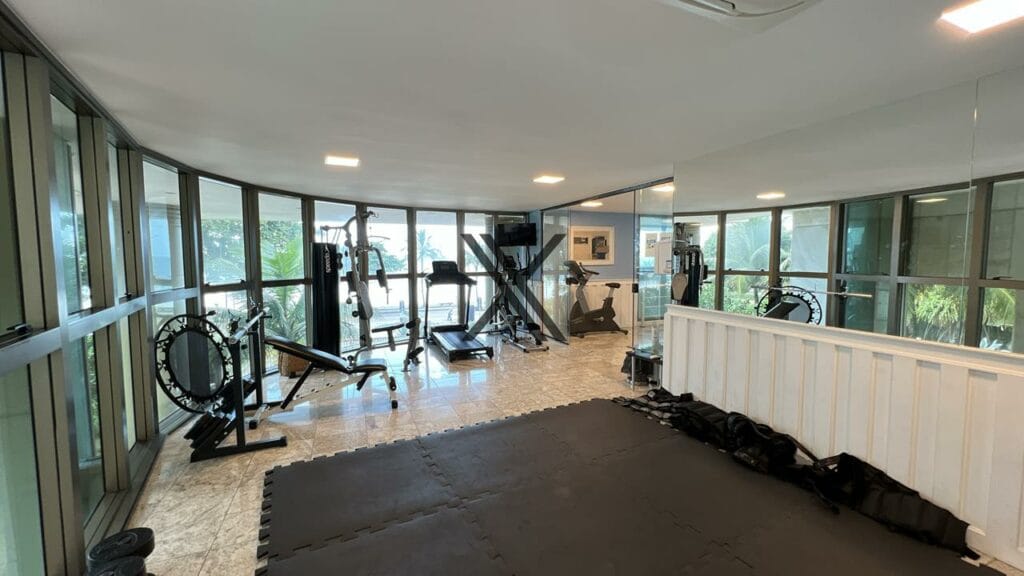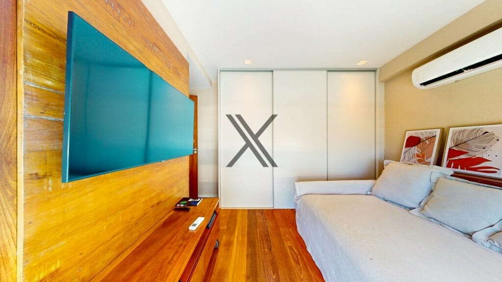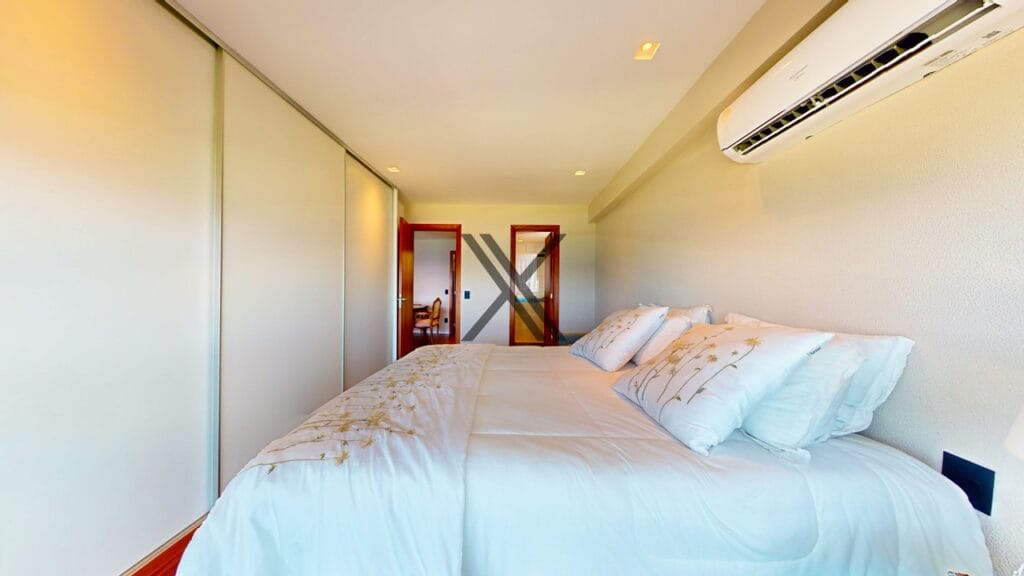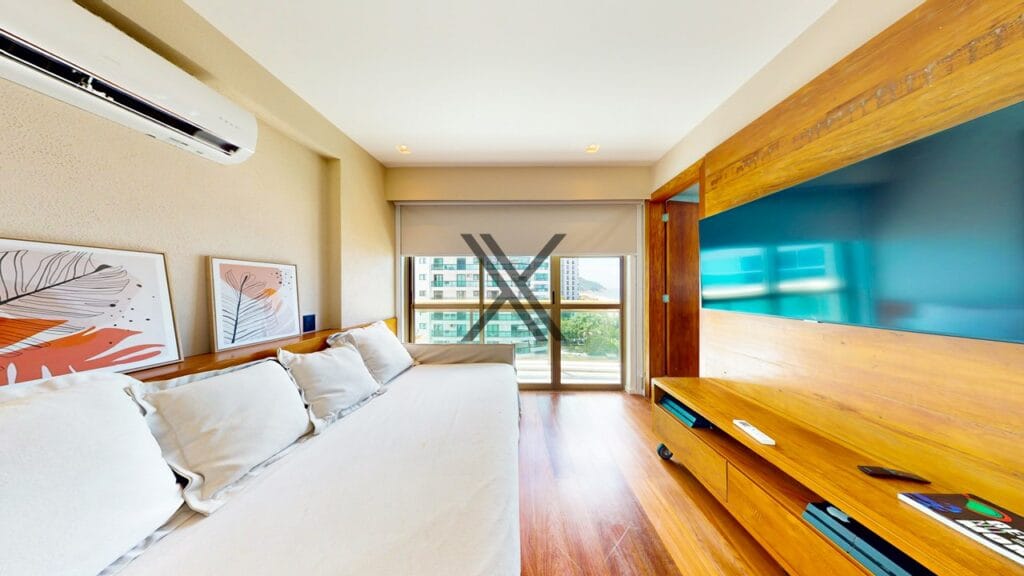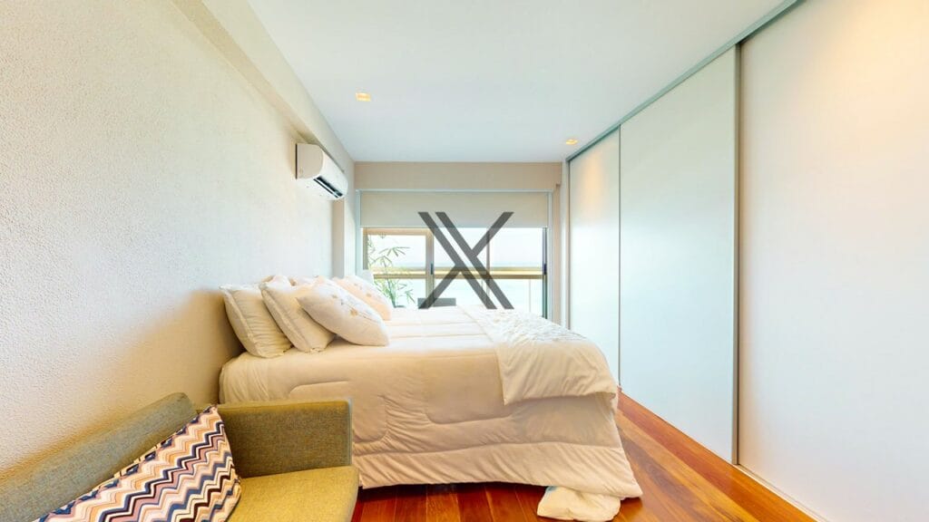 A parte privativa possui 2 quartos, sendo ambos suítes. A suíte master é um show à parte, pois conta com vista livre para o mar, além de dispor de um belo banheiro com ventilação natural. A outra suíte também conta com a mesma linda vista para o mar, grande quantidade de armários e está configurada como uma sala íntima de TV.