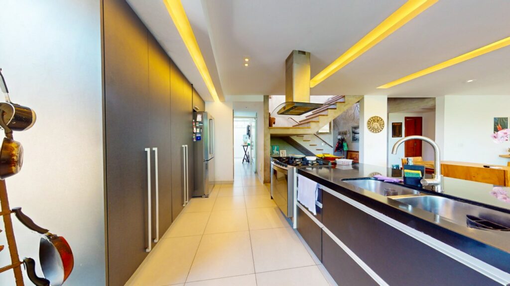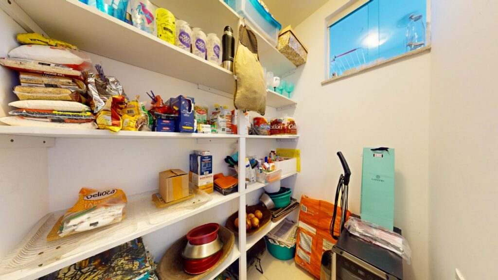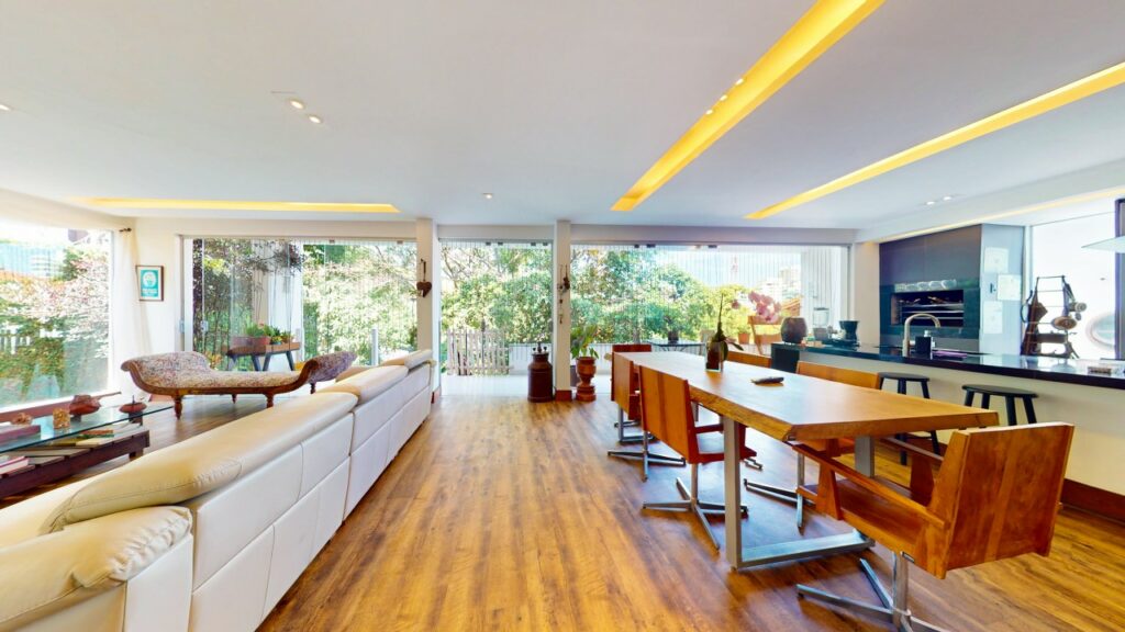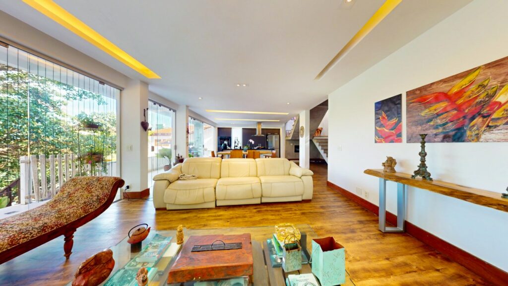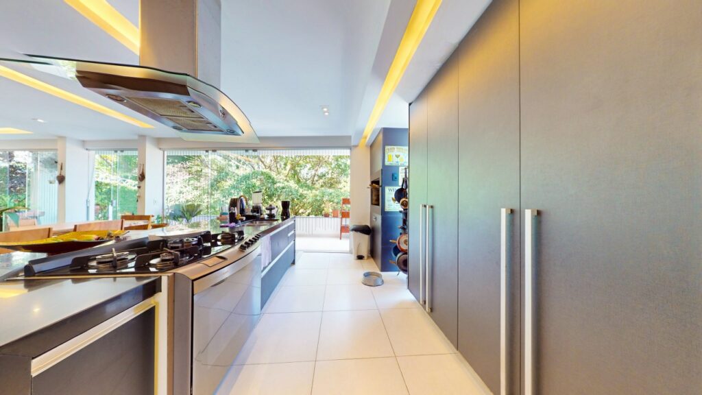 No primeiro pavimento, o imóvel possui uma sala aconchegante com iluminação indireta, piso em porcelanato, cozinha americana completa com muitos armários, coifa, cooktop, forno e churrasqueira, portas de correr em vidro com acesso à varanda voltada para a piscina em nível inferior, lavabo e um quarto com entrada independente para a área lateral externa. Em anexo, está a lavanderia com dependência completa.