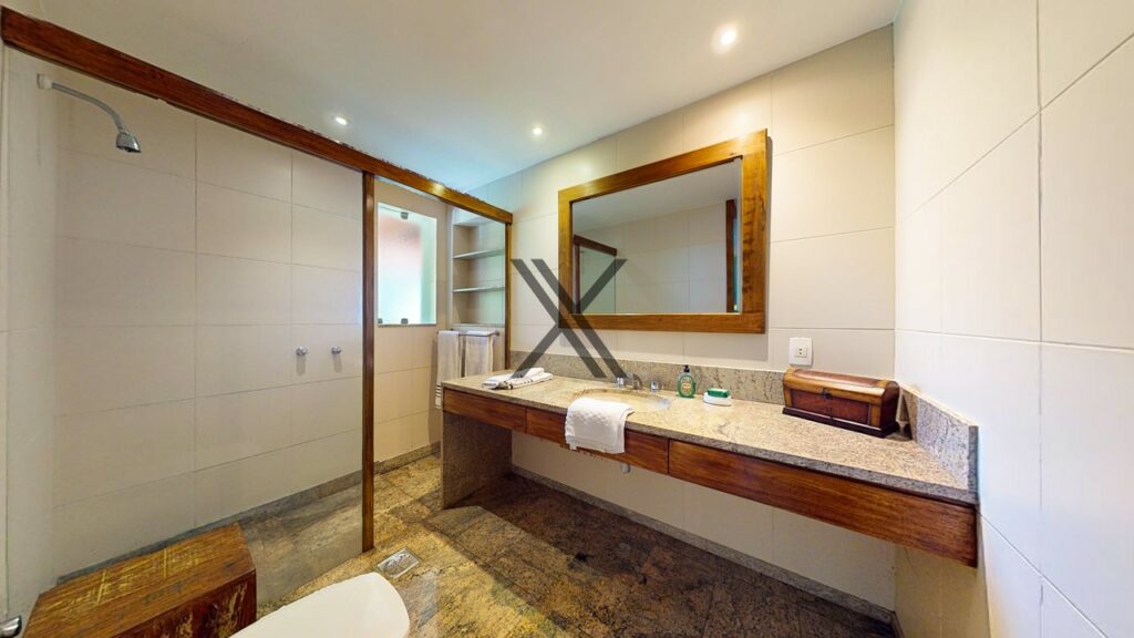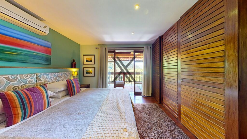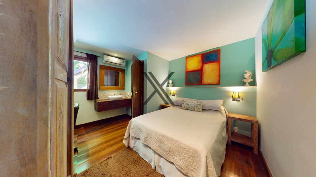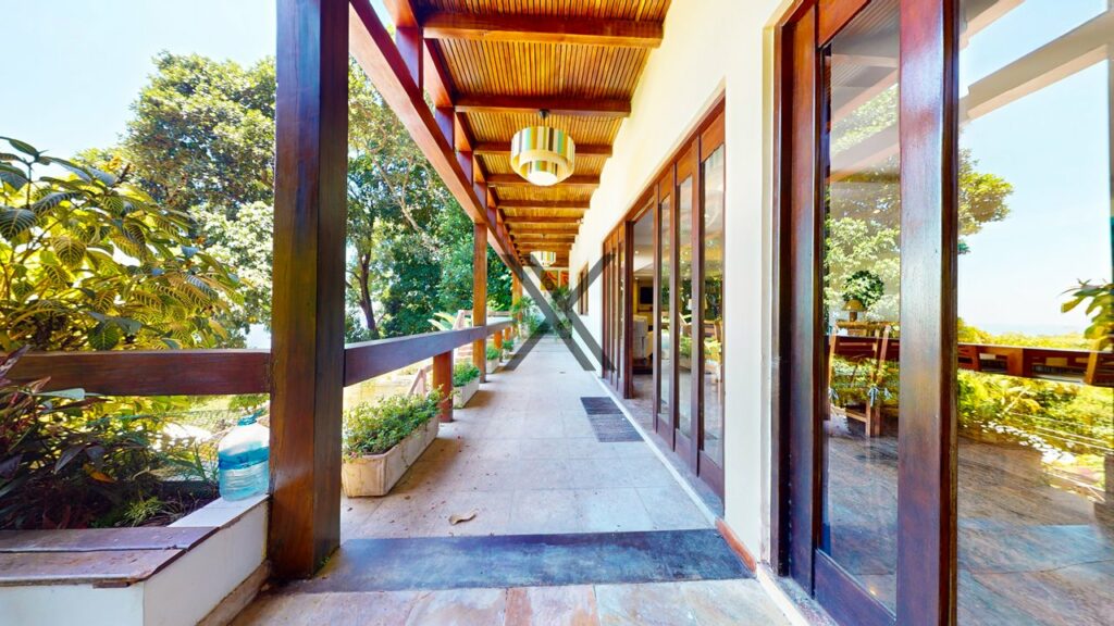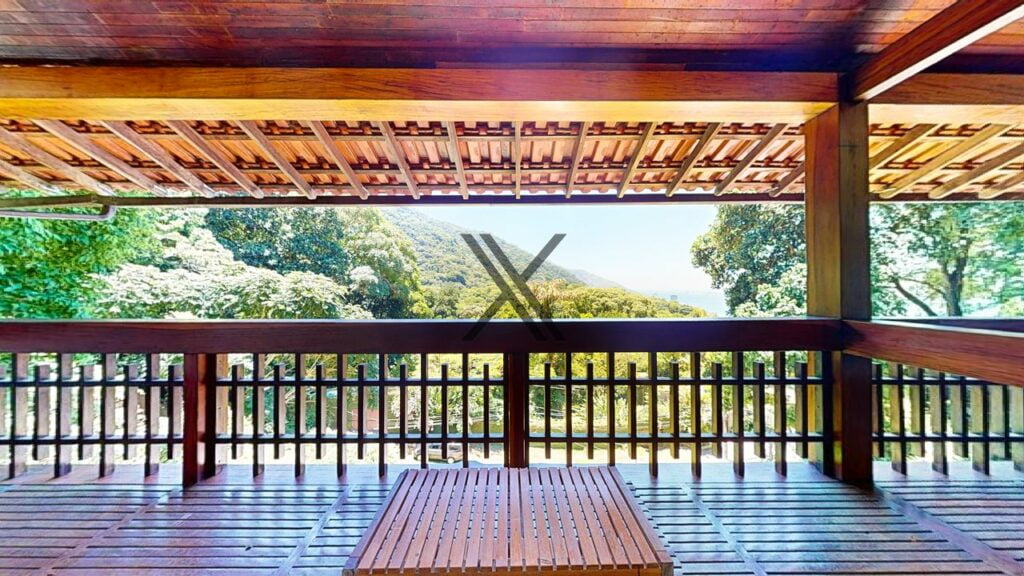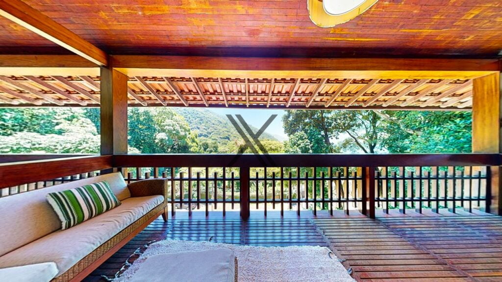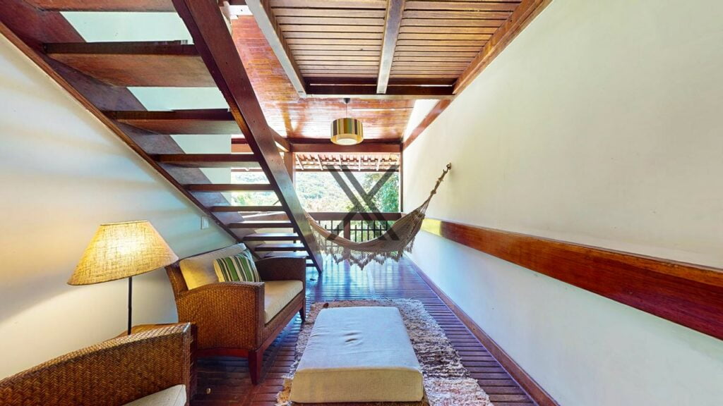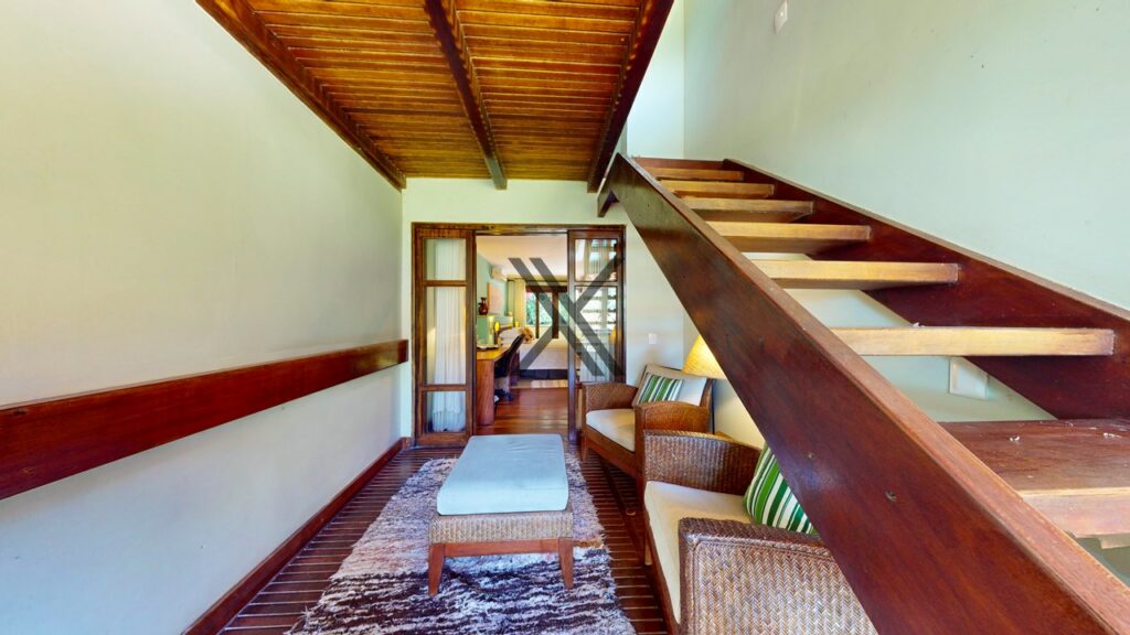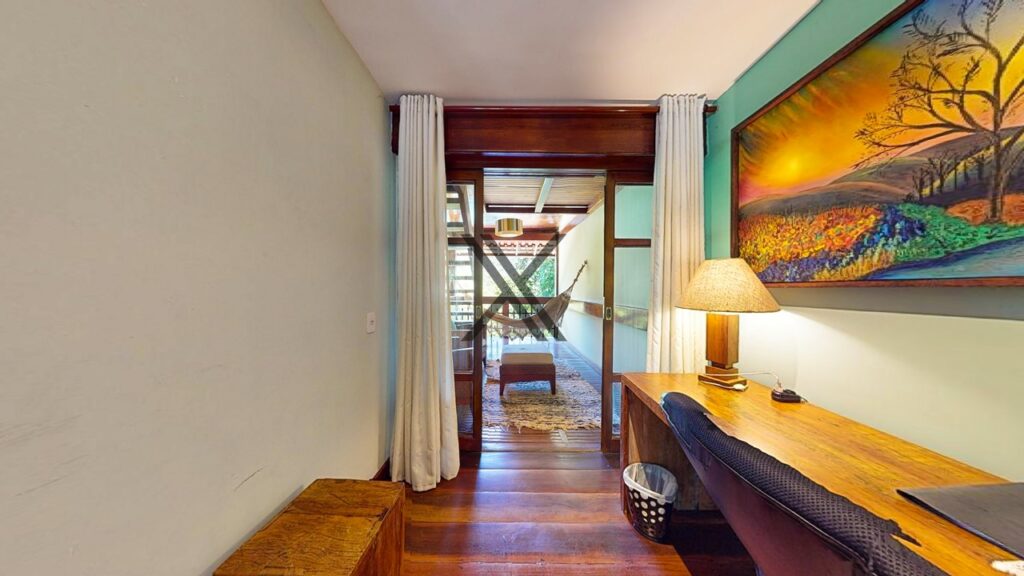 O segundo pavimento conta com 4 suítes de bom tamanho (sendo 1 suíte master com closet), escritório, acesso à varanda e ao mezanino. Na parte de trás da propriedade há mais 2 suítes, ambas com varandas.