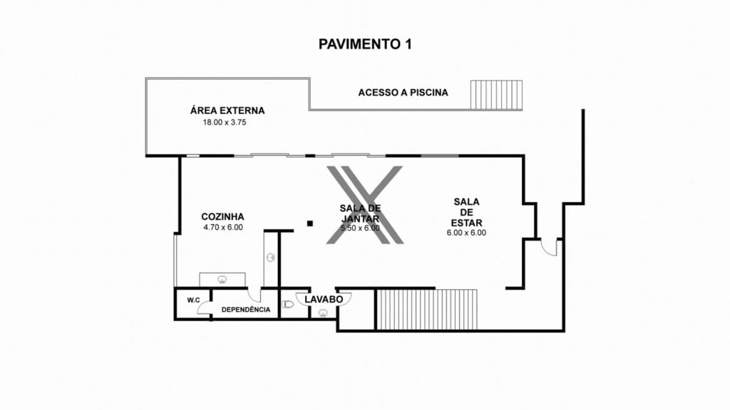 Situado no primeiro pavimento, o living é composto por uma sala de estar de plano aberto, sala de jantar, cozinha americana com armários, banheiro social, bar e acesso a uma generosa varanda com churrasqueira completa.