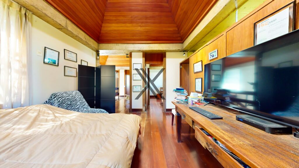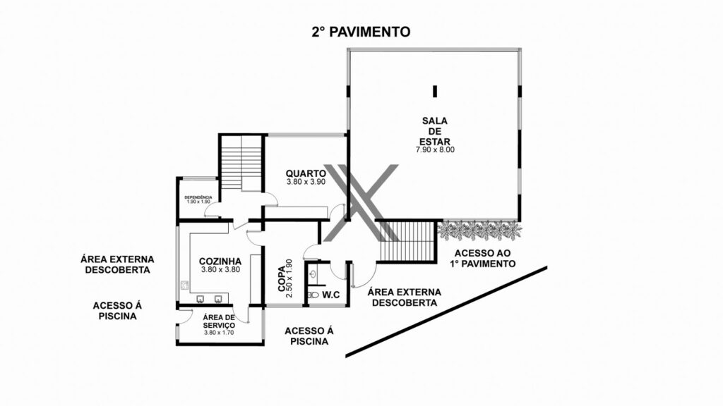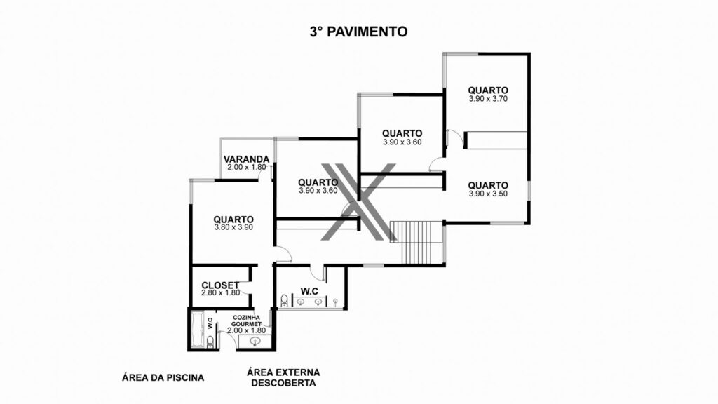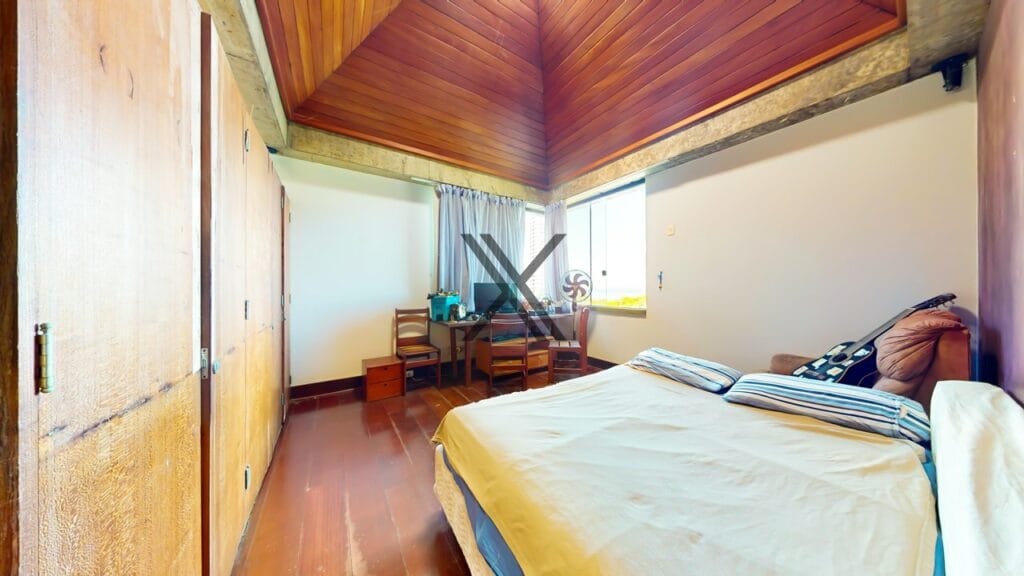 O 2º pavimento conta com 3 quartos, banheiro social e uma suíte com acesso direto à área externa de lazer.