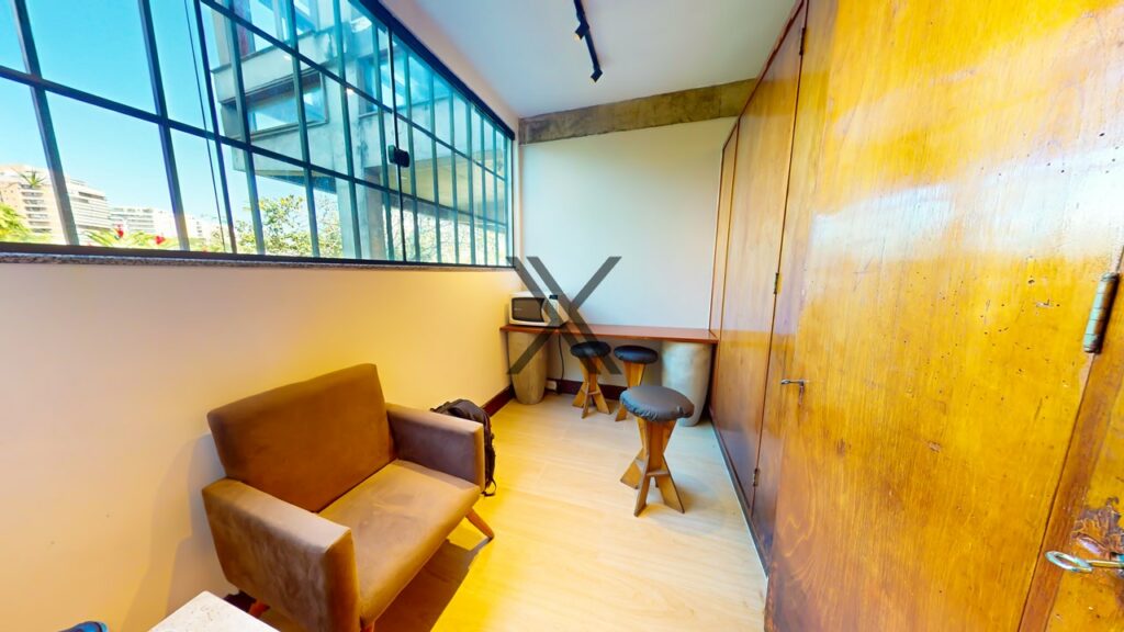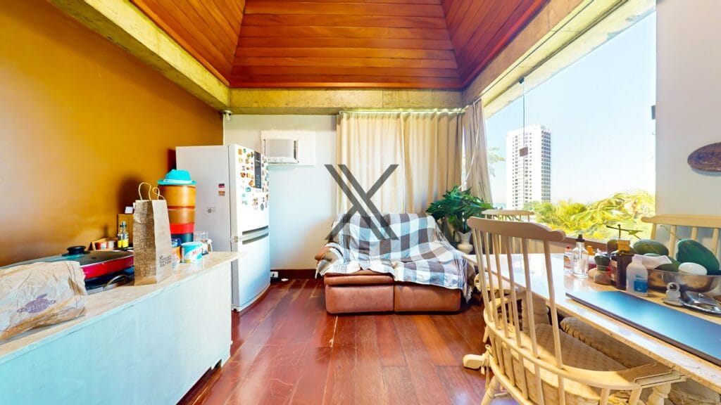 No 1º pavimento, há uma ampla sala com vista para a Pedra da Gávea, lavabo, quarto com vista para o mar, copa, cozinha e lavanderia. O acesso à cozinha pode ser feito também por meio do anexo no térreo.