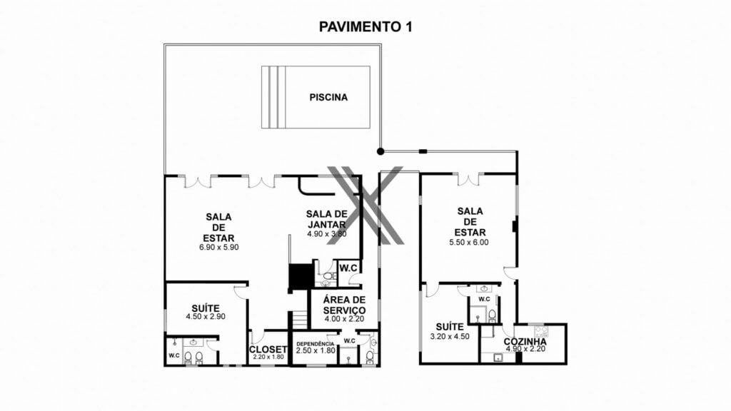 No pavimento inferior, encontram-se o lavabo, a cozinha, e as salas de estar e jantar, além do acesso à garagem. Próximo à garagem, há 2 dependências completas e a lavanderia.