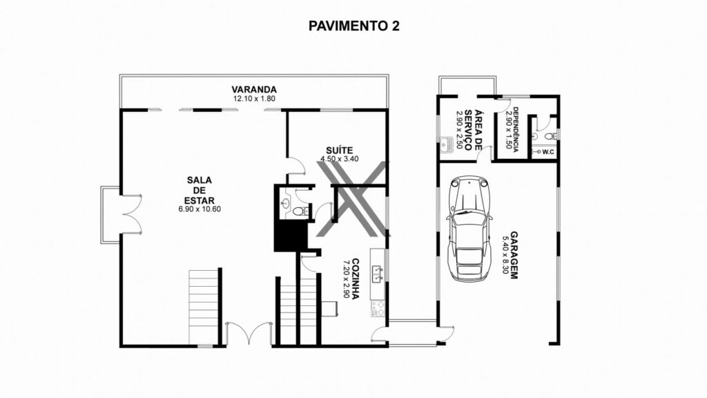 O pavimento térreo é composto por uma sala com múltiplos ambientes, uma ampla cozinha e varanda.