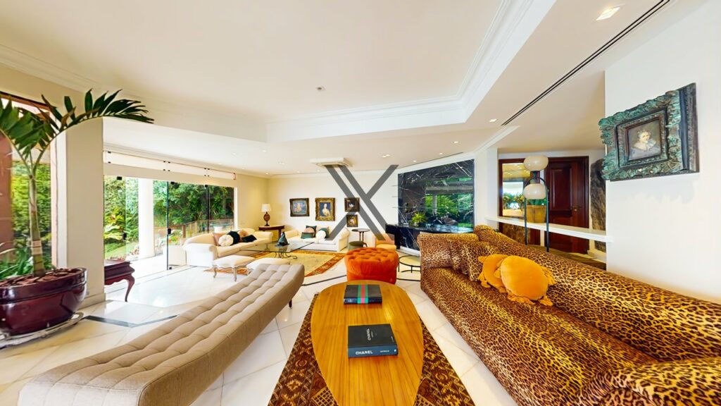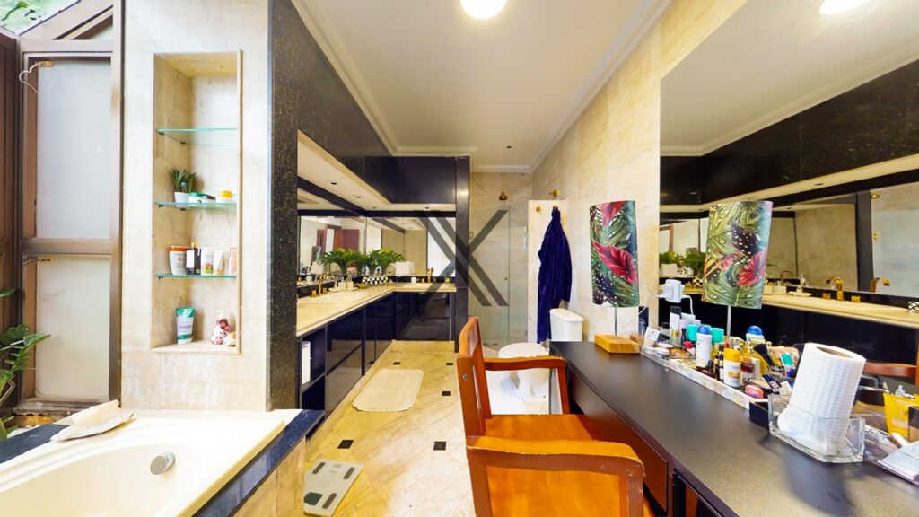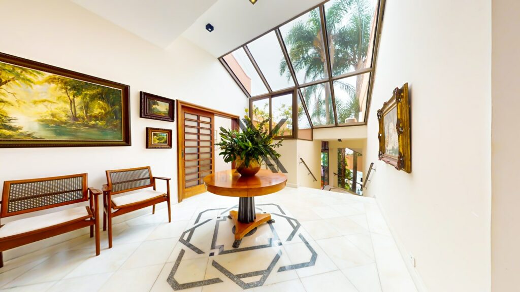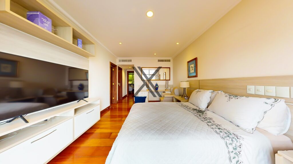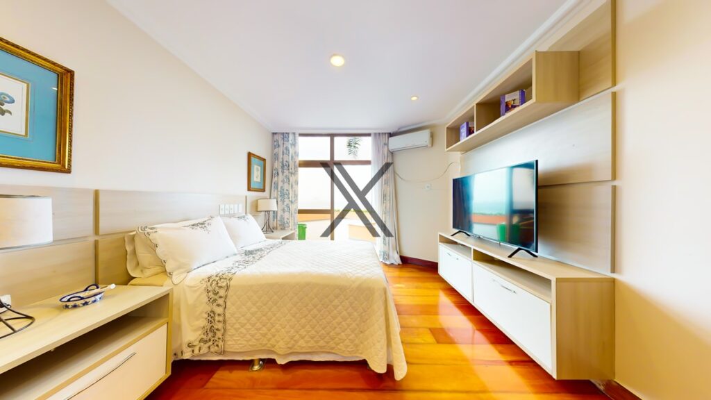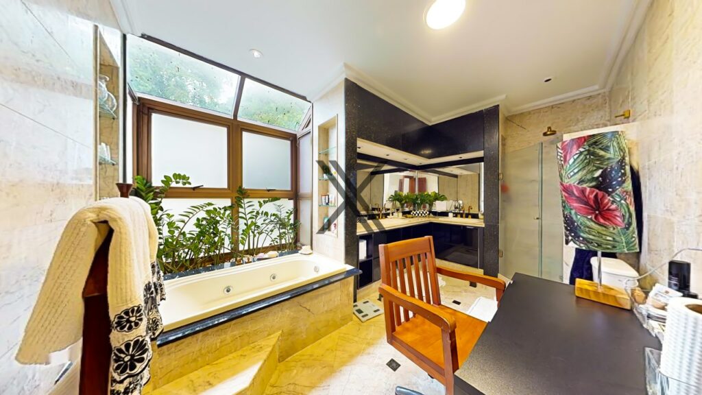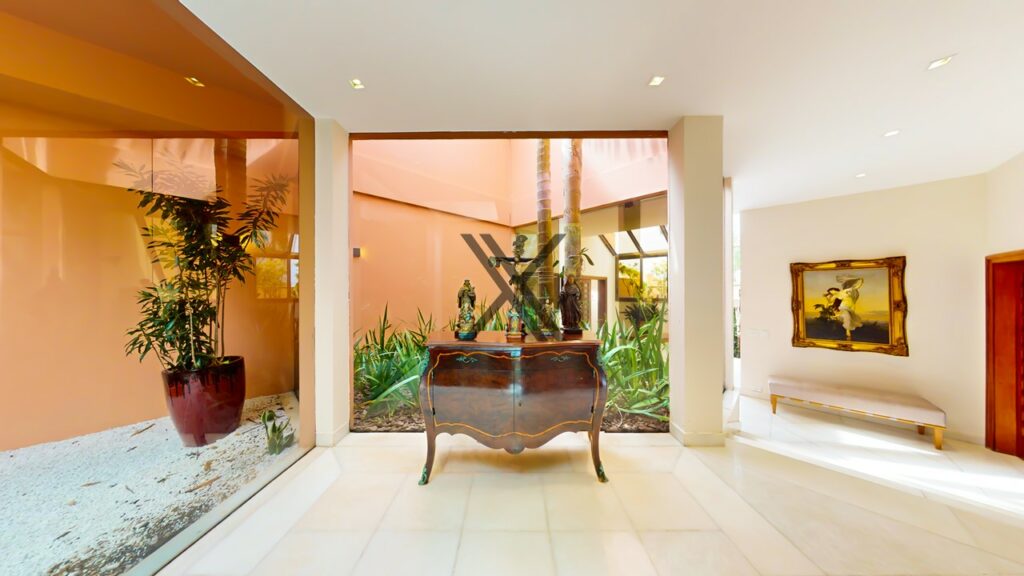 A casa dispõe de um hall de entrada com um belo jardim de inverno e, em um nível superior, da parte privativa com sala de estar, roupeiro e 4 espaçosas suítes – 2 dessas possuem banheiro canadense, tornando os cômodos maiores e mais confortáveis. Todas as suítes possuem closet, split e acesso a uma varanda central com vista para o mar, sendo que a suíte master possui duplo closet e hidromassagem em seu banheiro.