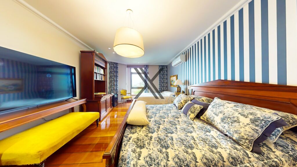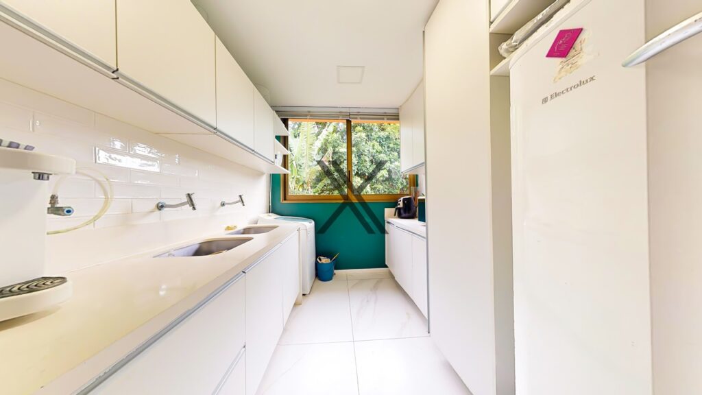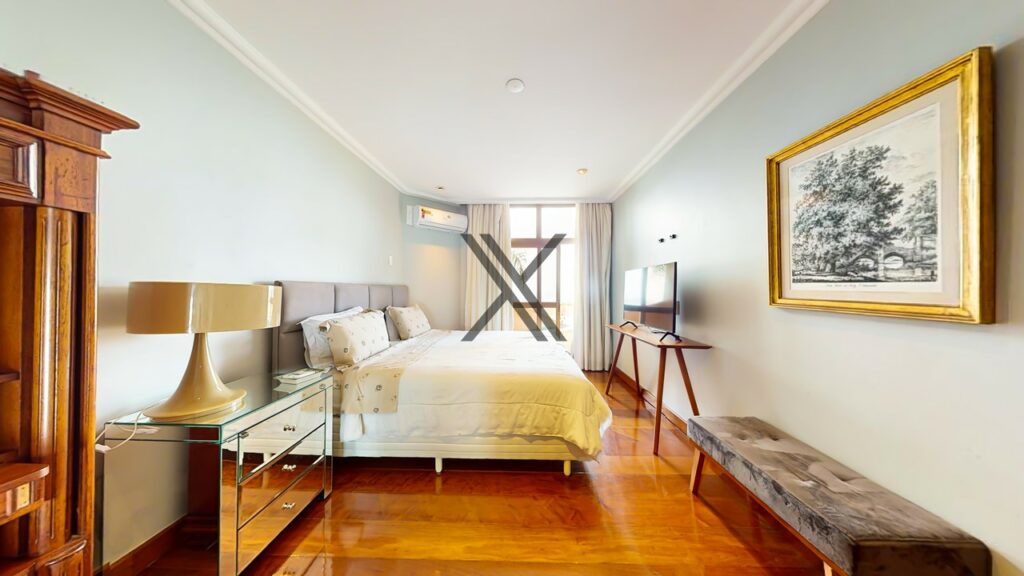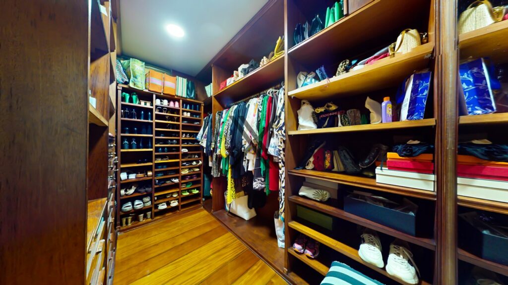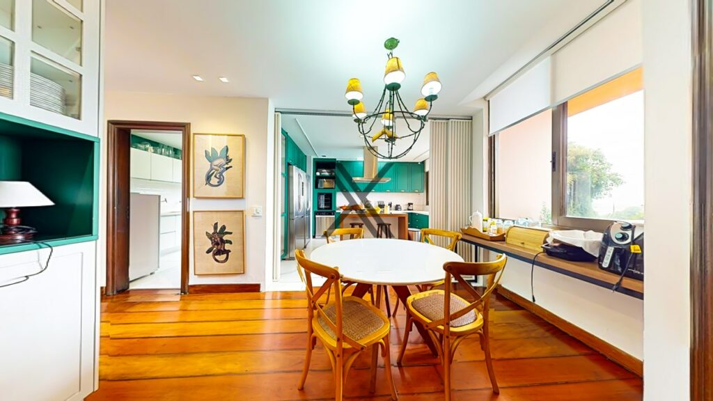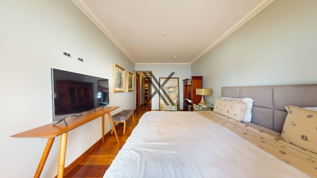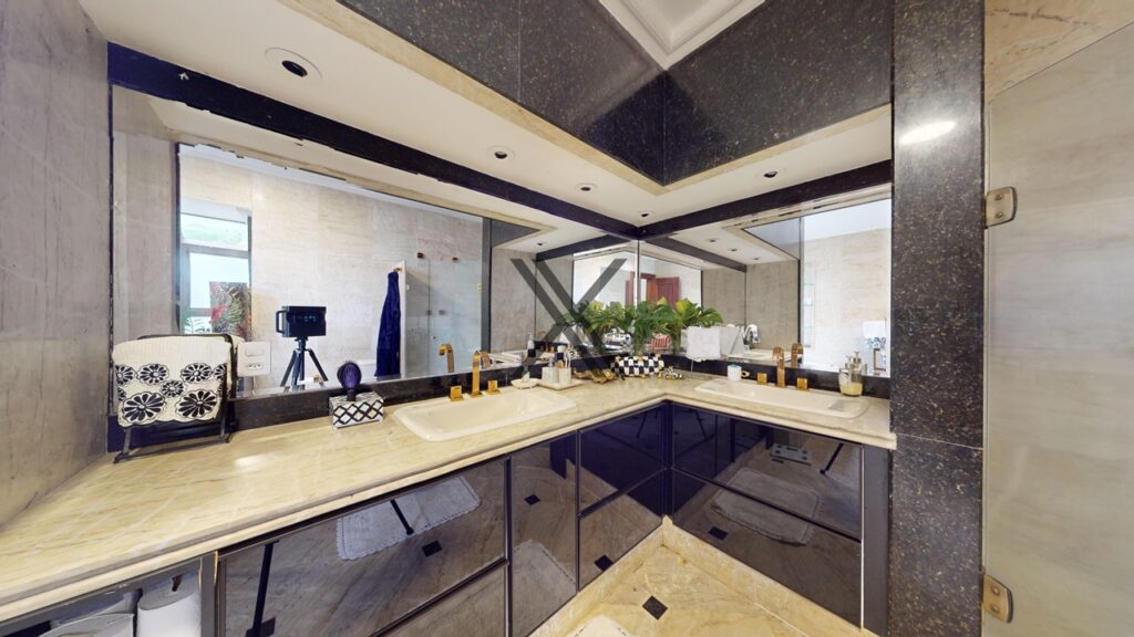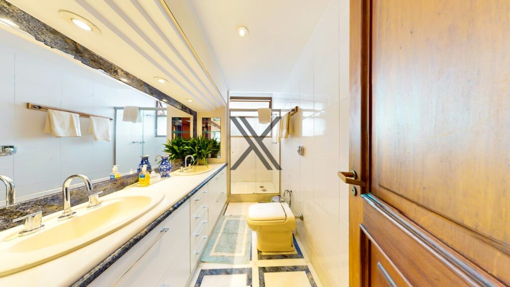 A casa dispõe de um hall de entrada com um belo jardim de inverno e, em um nível superior, da parte privativa com sala de estar, roupeiro e 4 espaçosas suítes – 2 dessas possuem banheiro canadense, tornando os cômodos maiores e mais confortáveis. Todas as suítes possuem closet, split e acesso a uma varanda central com vista para o mar, sendo que a suíte master possui duplo closet e hidromassagem em seu banheiro.