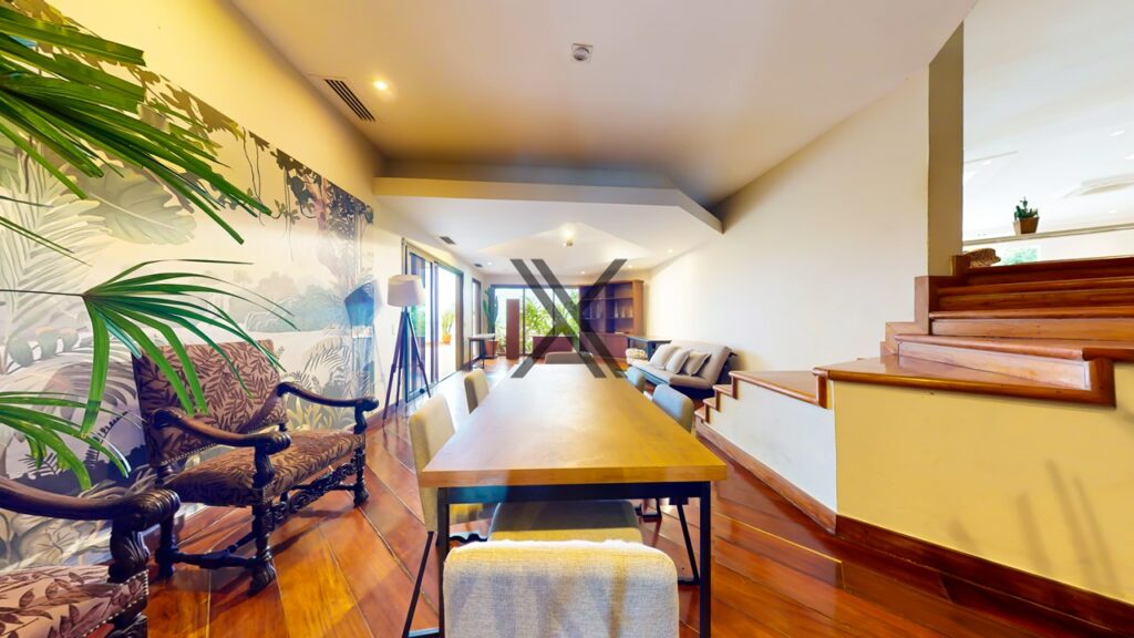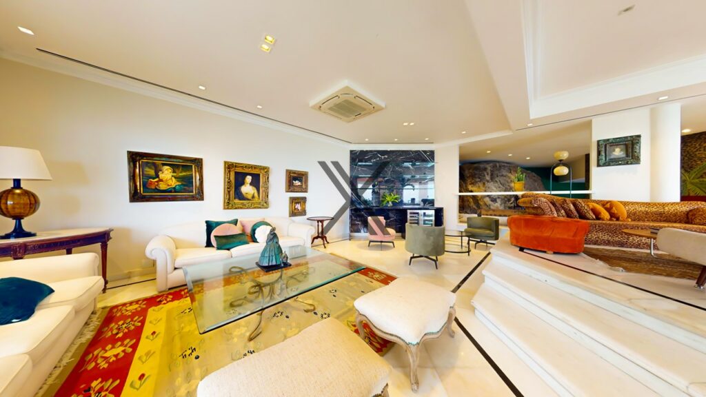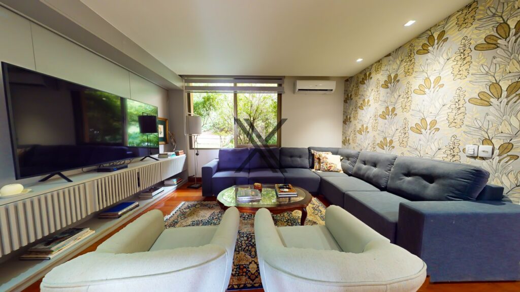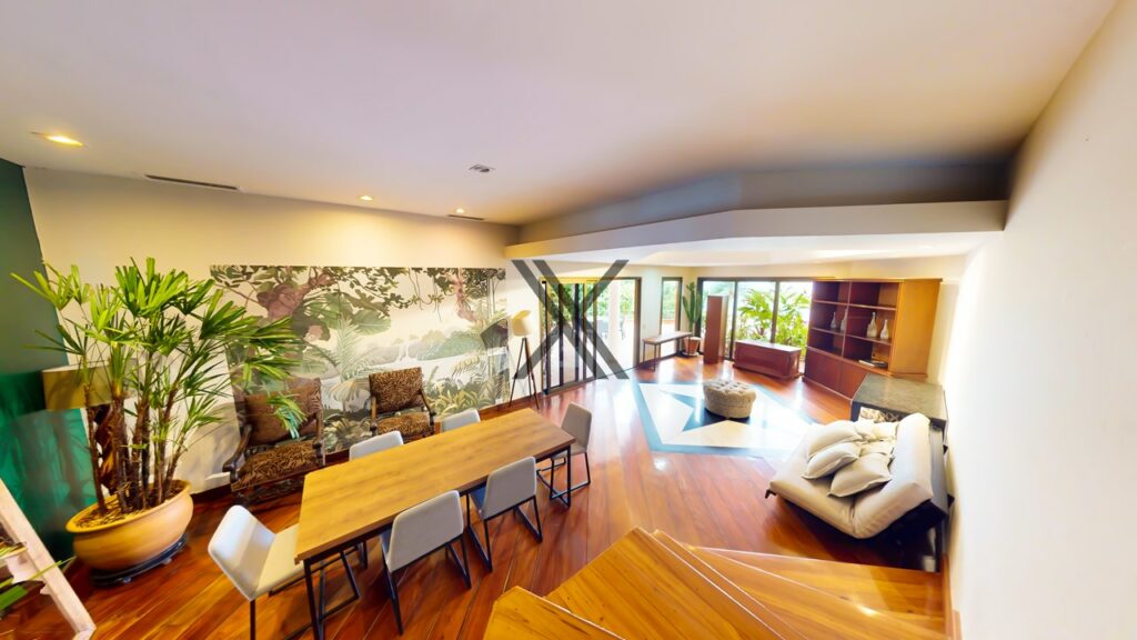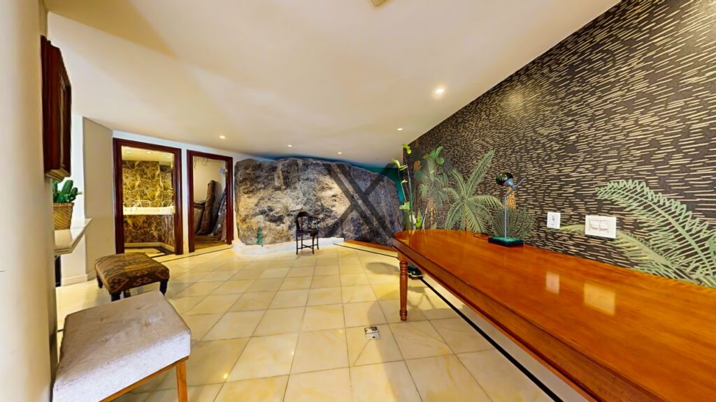 Seguindo em mais um nível inferior, encontramos uma majestosa sala em 4 ambientes, lavabo e outra suíte conectada à extensa varanda. Uma escada, que leva a outra sala em seu piso mais baixo, possui uma linda parede de pedra maciça em um dos lados que interliga as salas entre si.