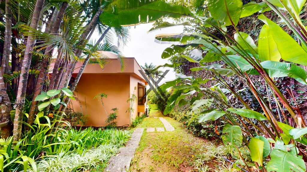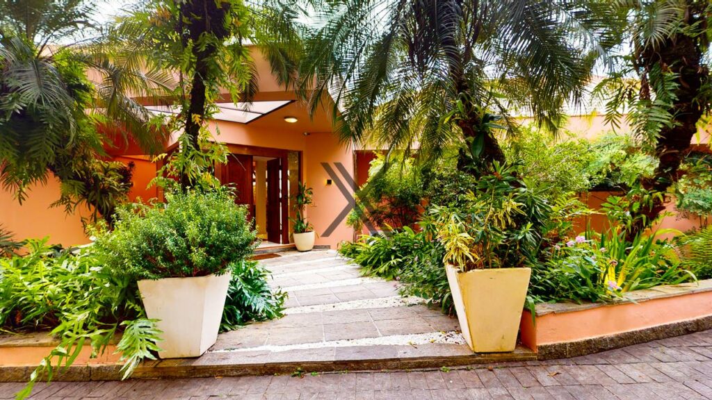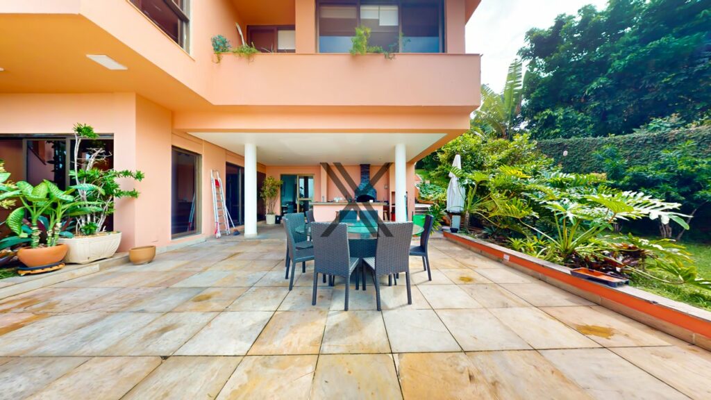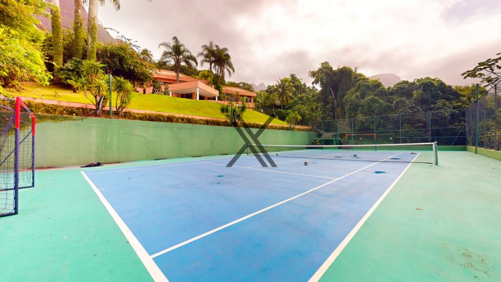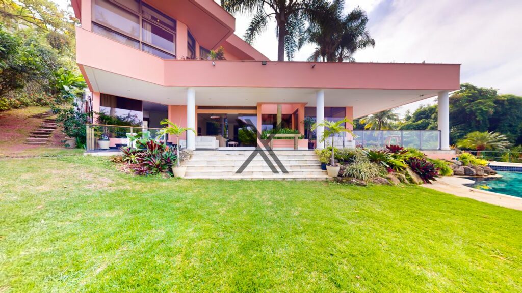 A casa oferece um paisagismo exuberante, composto por jardins bem cuidados que transmitem uma sensação de tranquilidade. A área de lazer conta com um amplo deck, onde há uma piscina com borda infinita, churrasqueira, sauna e banheiro. Esse espaço possui ainda um anexo com mais uma cozinha, cômodo, banheiro e uma admirável quadra poliesportiva.
