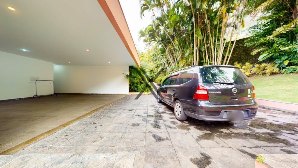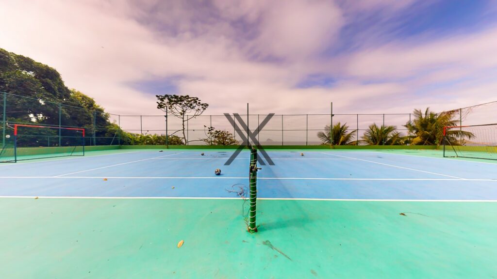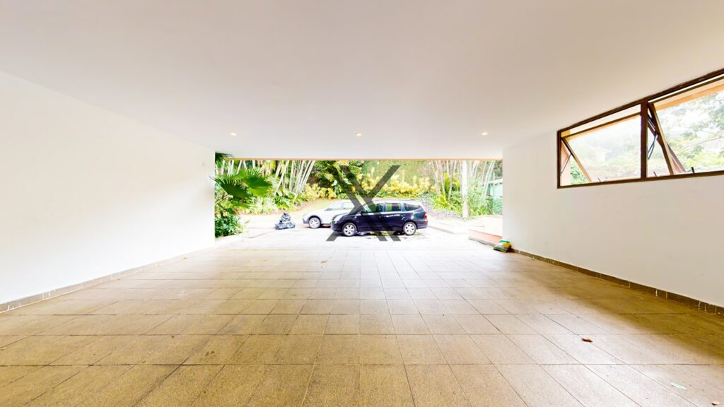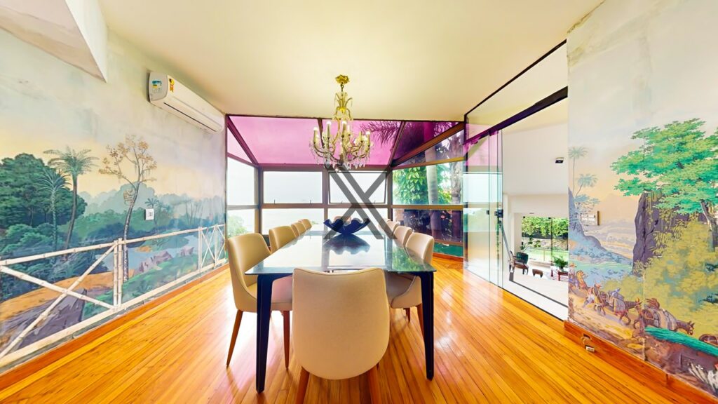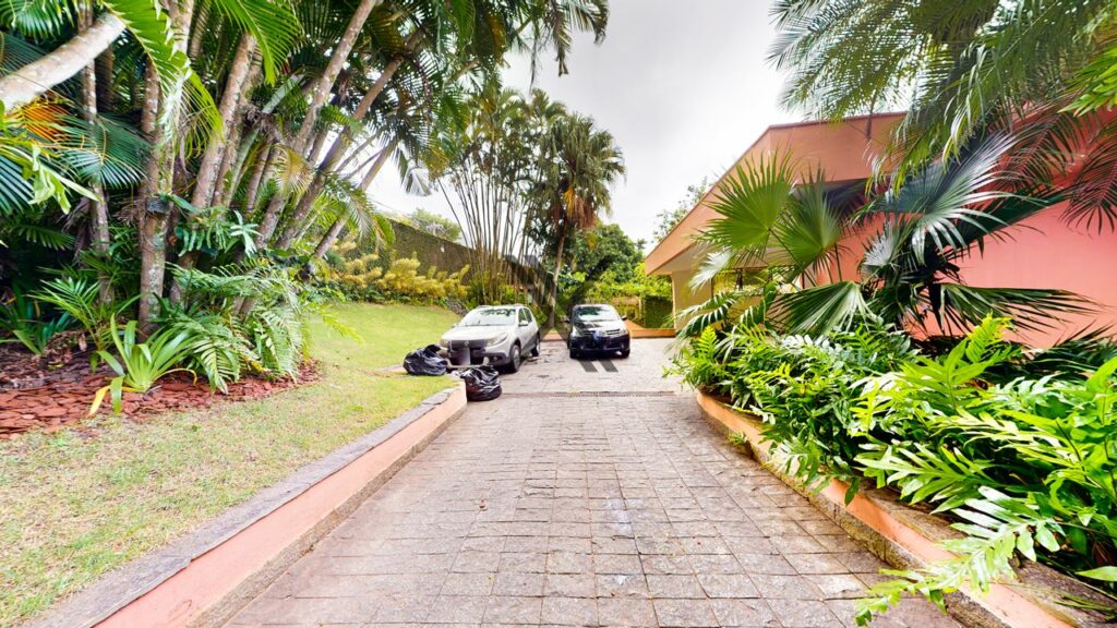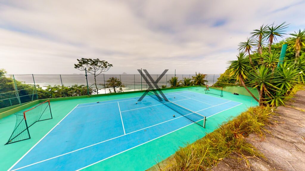 A casa oferece um paisagismo exuberante, composto por jardins bem cuidados que transmitem uma sensação de tranquilidade. A área de lazer conta com um amplo deck, onde há uma piscina com borda infinita, churrasqueira, sauna e banheiro. Esse espaço possui ainda um anexo com mais uma cozinha, cômodo, banheiro e uma admirável quadra poliesportiva.