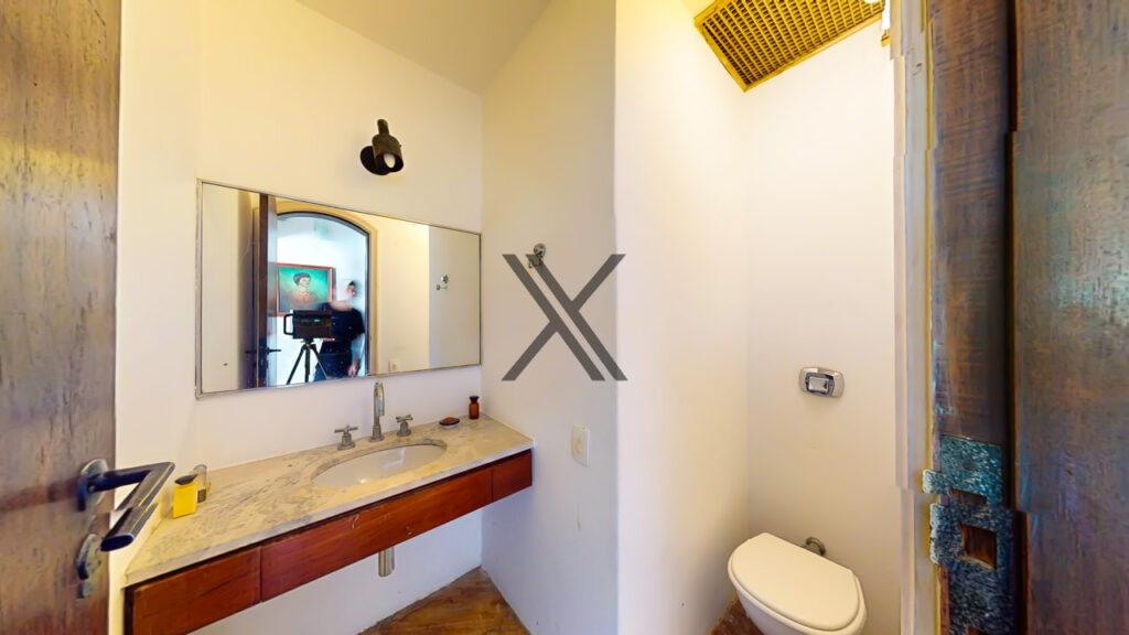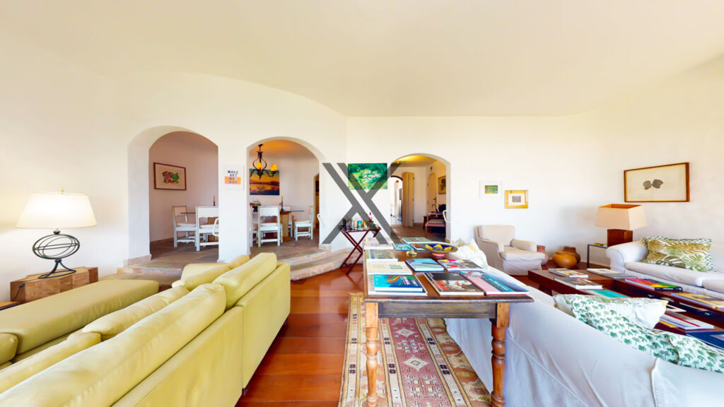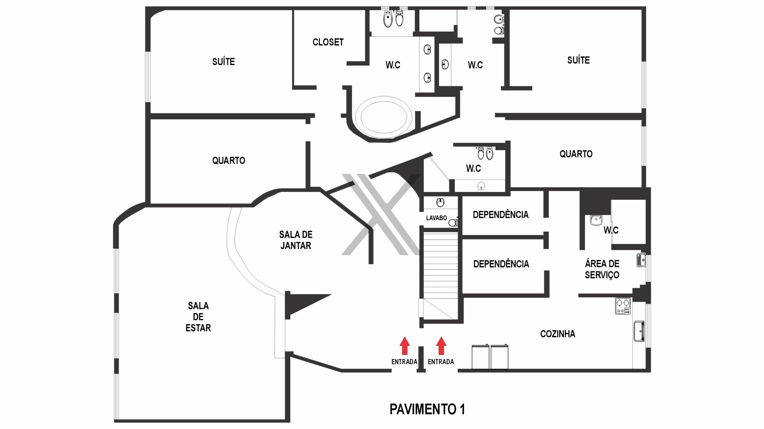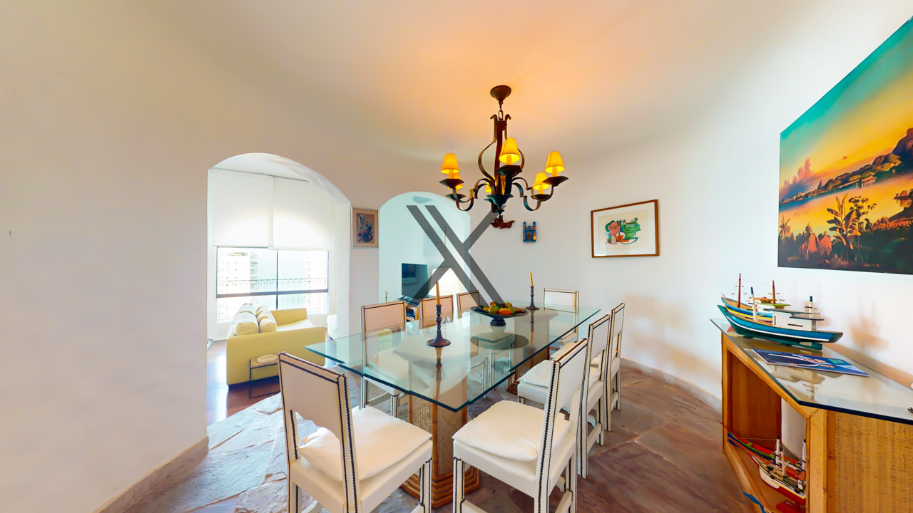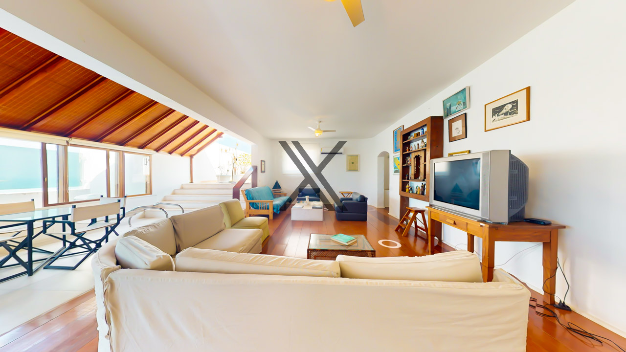 No primeiro pavimento, o hall de entrada oferece uma vista agradável para a praia, além de dar acesso à ampla sala de estar em três ambientes. O imóvel possui uma confortável área de TV, uma ampla sala de estar e uma reservada sala de jantar, com mesa para 8 lugares. Além disso, para o suporte de visitas e moradores, o ambiente possui um lavabo.