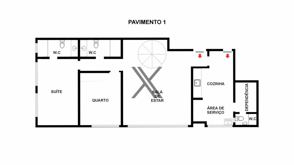 No primeiro pavimento, há um amplo living com ótima iluminação e ventilação naturais, podendo ser dividido em até dois ambientes, e uma bela escada em caracol que dá acesso ao segundo pavimento.